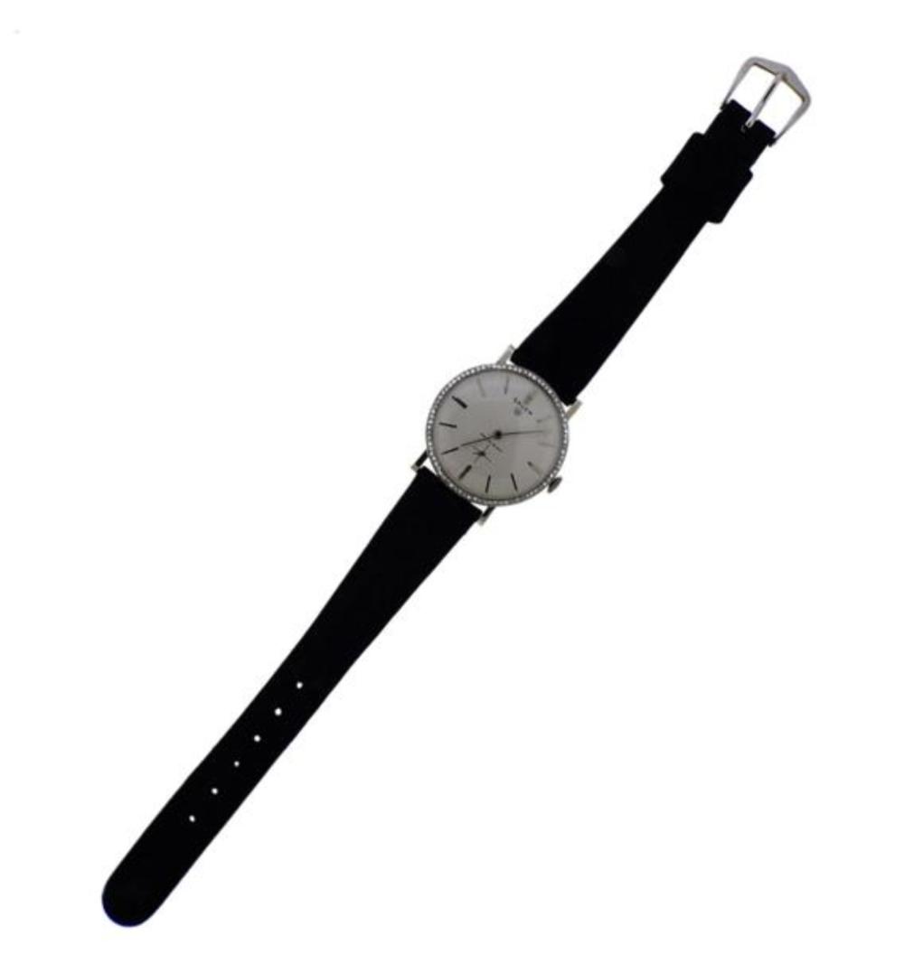 It is a 14k white gold gents Gruen 21 jewel watch with 80 diamonds surrounding the Bezel.