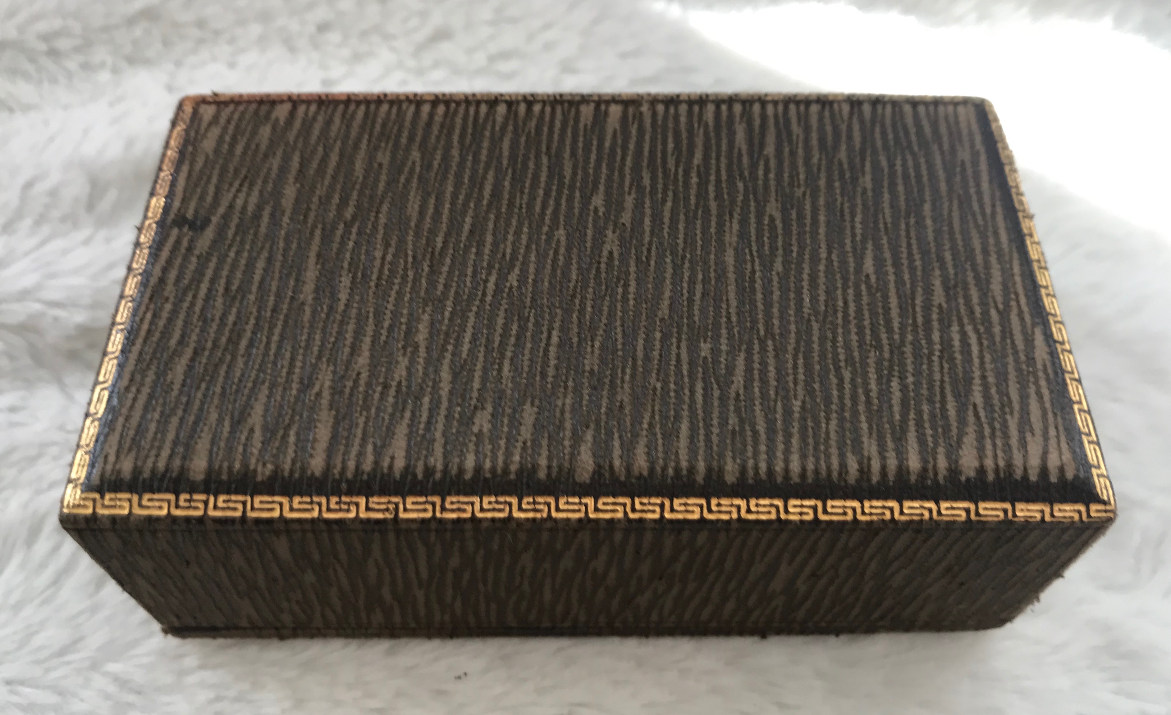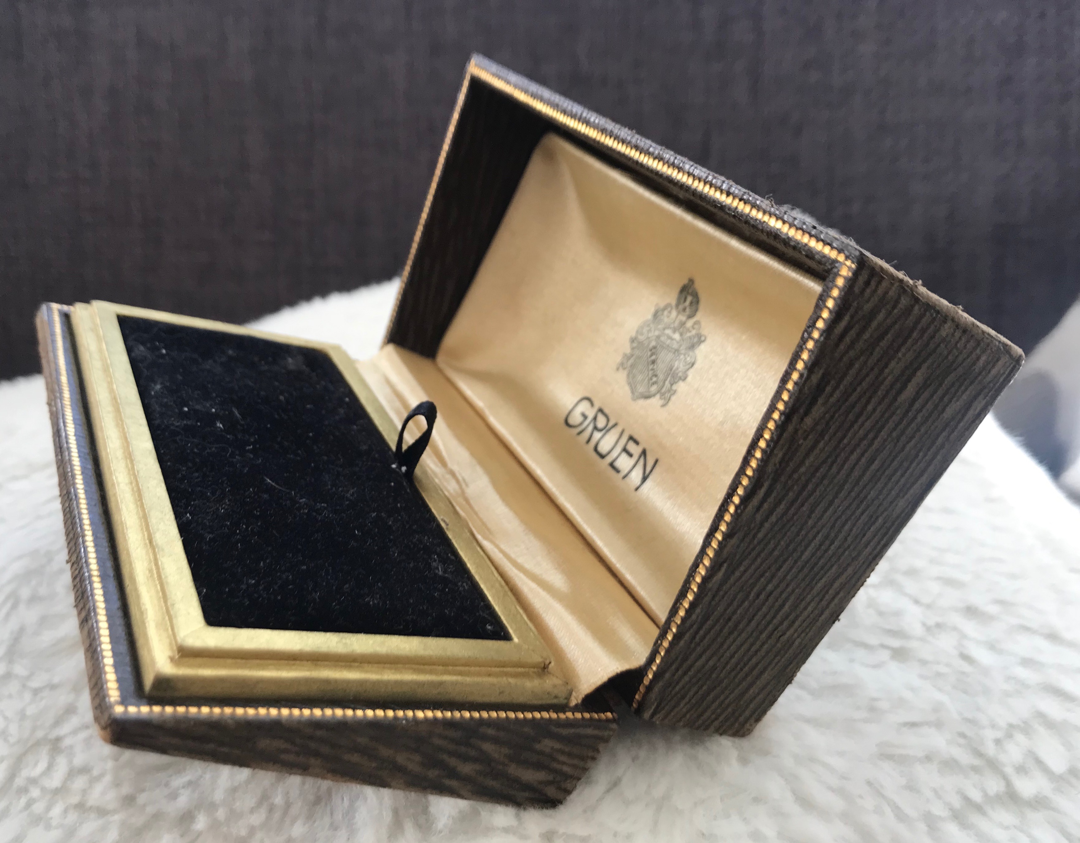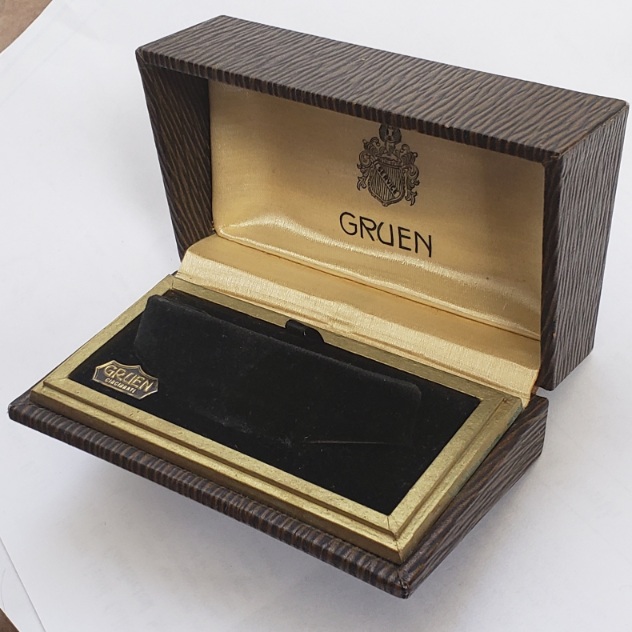 Fake leather paper and wood box. Greek golden rim. Sloping watch holder (not original).gruen service crest inside.