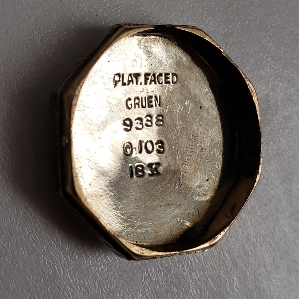 Other info : Plat. Faced, Gruen, 9338, O 103. 18k. Gruen crown; not original.