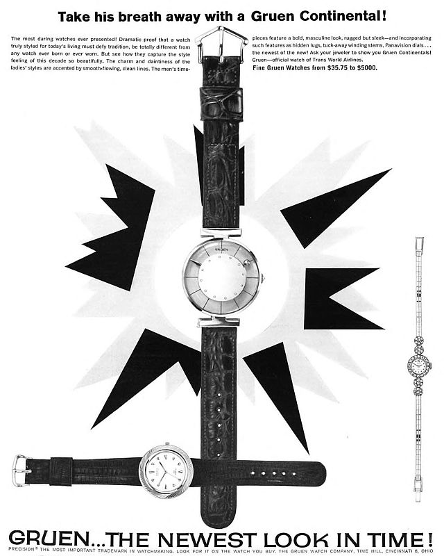 Thank you Case, glad to join the forum. Gruen made some very unusual pieces with 'dots' that I really like. The watch runs great but I will service it eventually. Still great to know there is an abundance of parts available for it. I've seen one ad for a different but similar model (same dial, hands, and crystal). I don't know if this is a recased version of that or not, but I would assume not as the dial feet go directly onto the case and the case seems to match everything. (It was an ad under the 1950's section, it was not labeled though sadly.) Cheers!