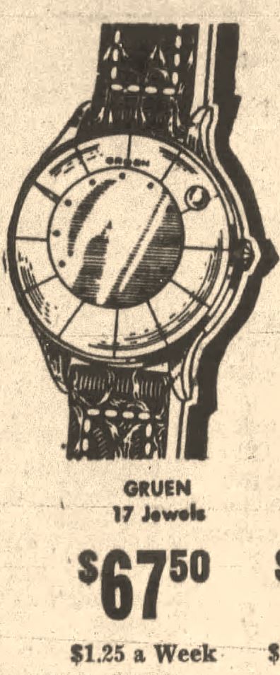 Beside the two versions of the books, which are copyrighted, so I could not post photos from there, I found this watch only pictured once in an advertisement in a local newspaper, "The News-Palladium" from Benton Harbor, Michigan. It is a jewelers ad from "Fox's" advertised in a clearance sale in the July 29, 1958 issue. Again this fact shows that it is an "older" watch, first issued before 1958.