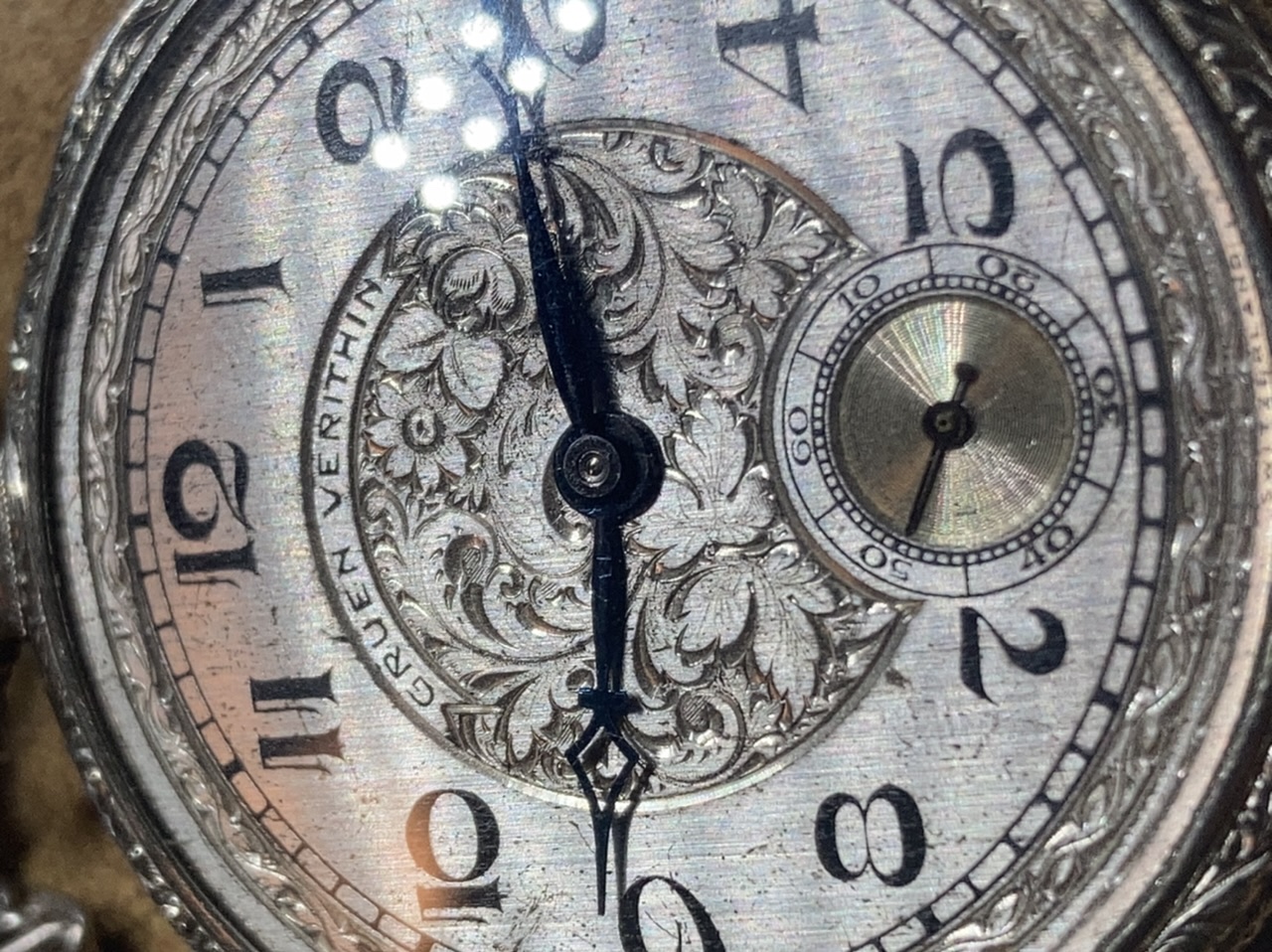 It did not come from the factory with that hand on it, though. I have one of these with original hands, and the shape of the diamond is subtly different. Stubbier, and shorter. I think these hands started as normal V7 hands that were carefully stoned down to size before blueing. Both hour and minute differ - the entire outer (not inner) tip geometry is different from normal Gruen cathedral hands.