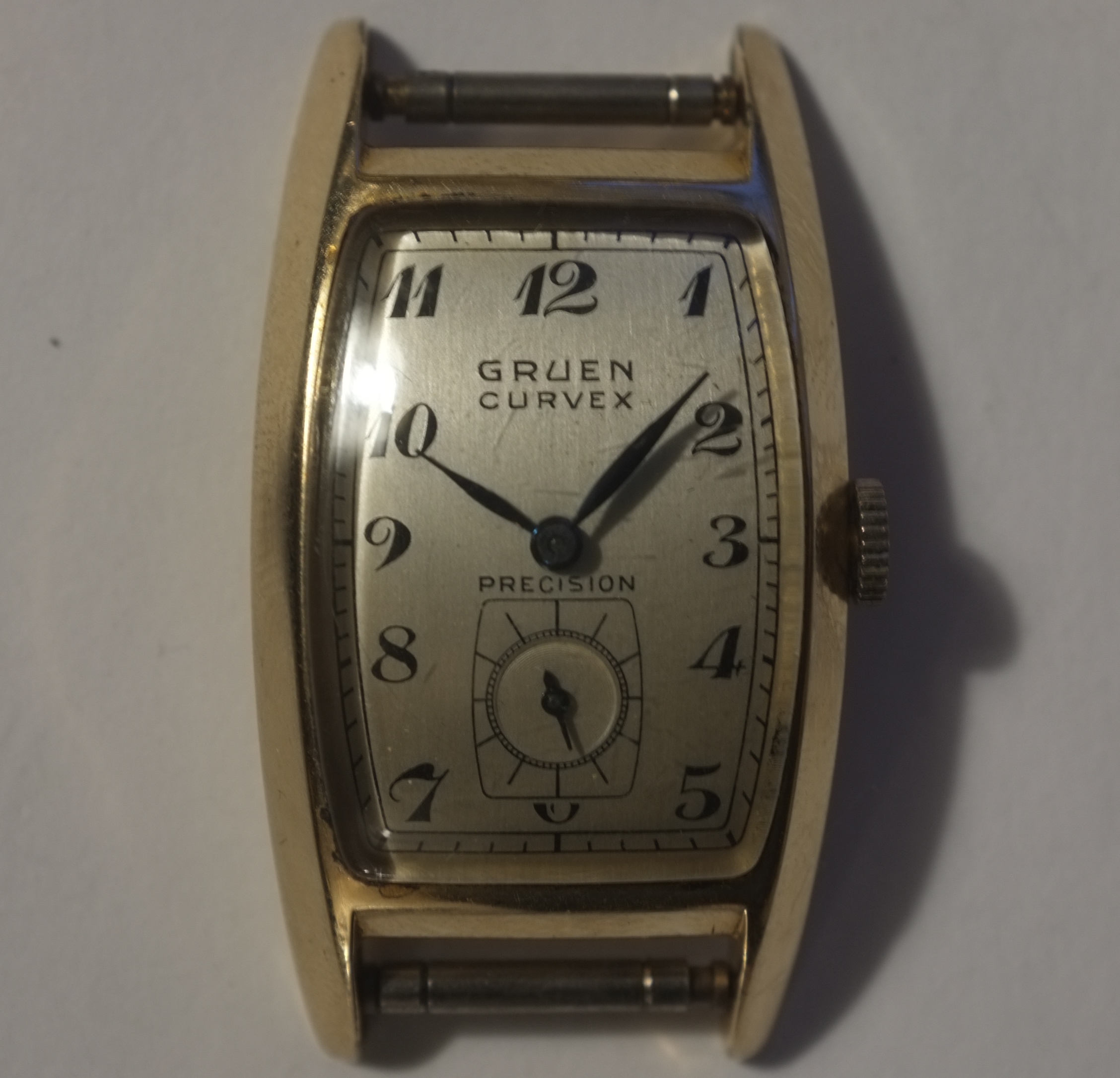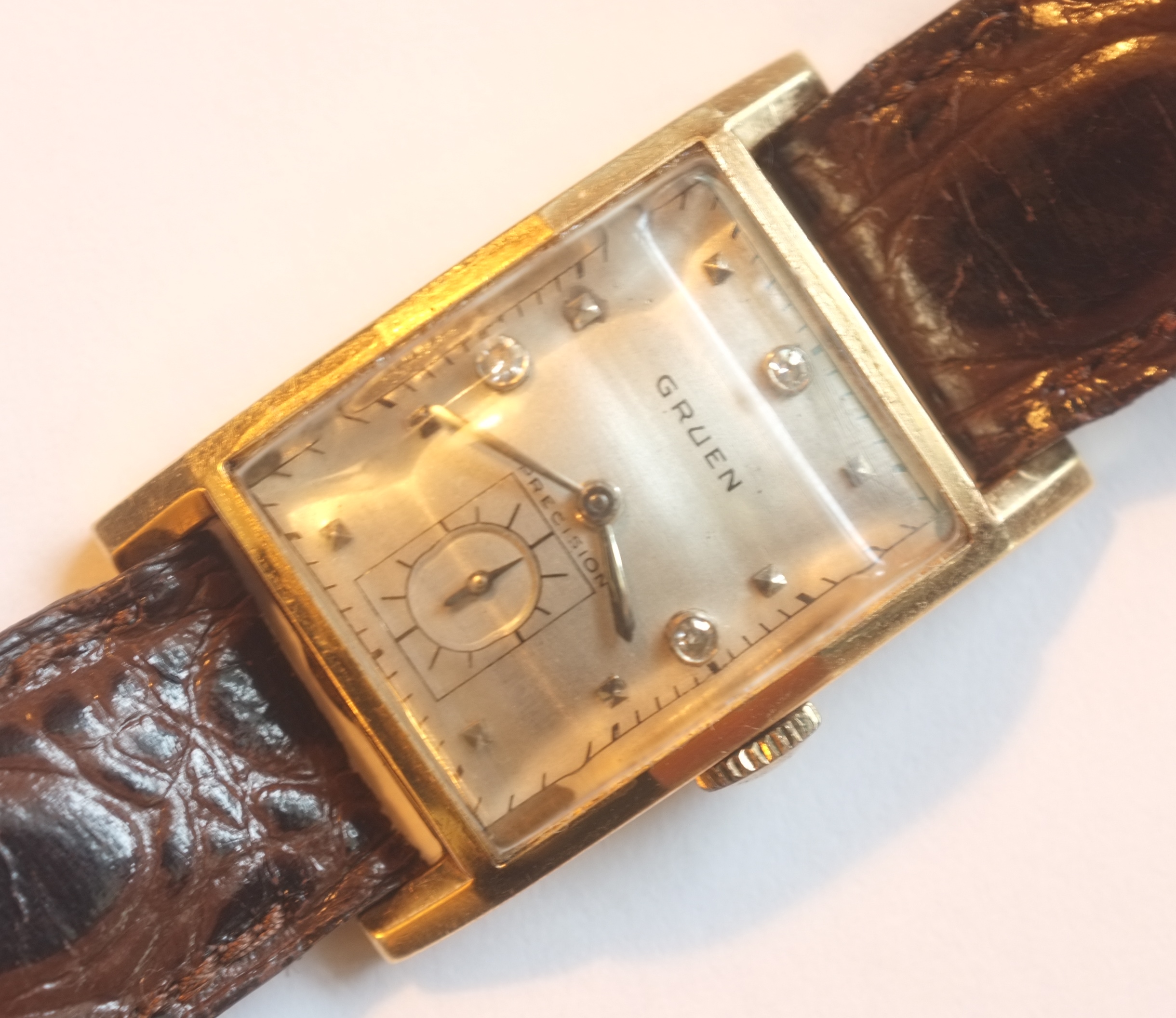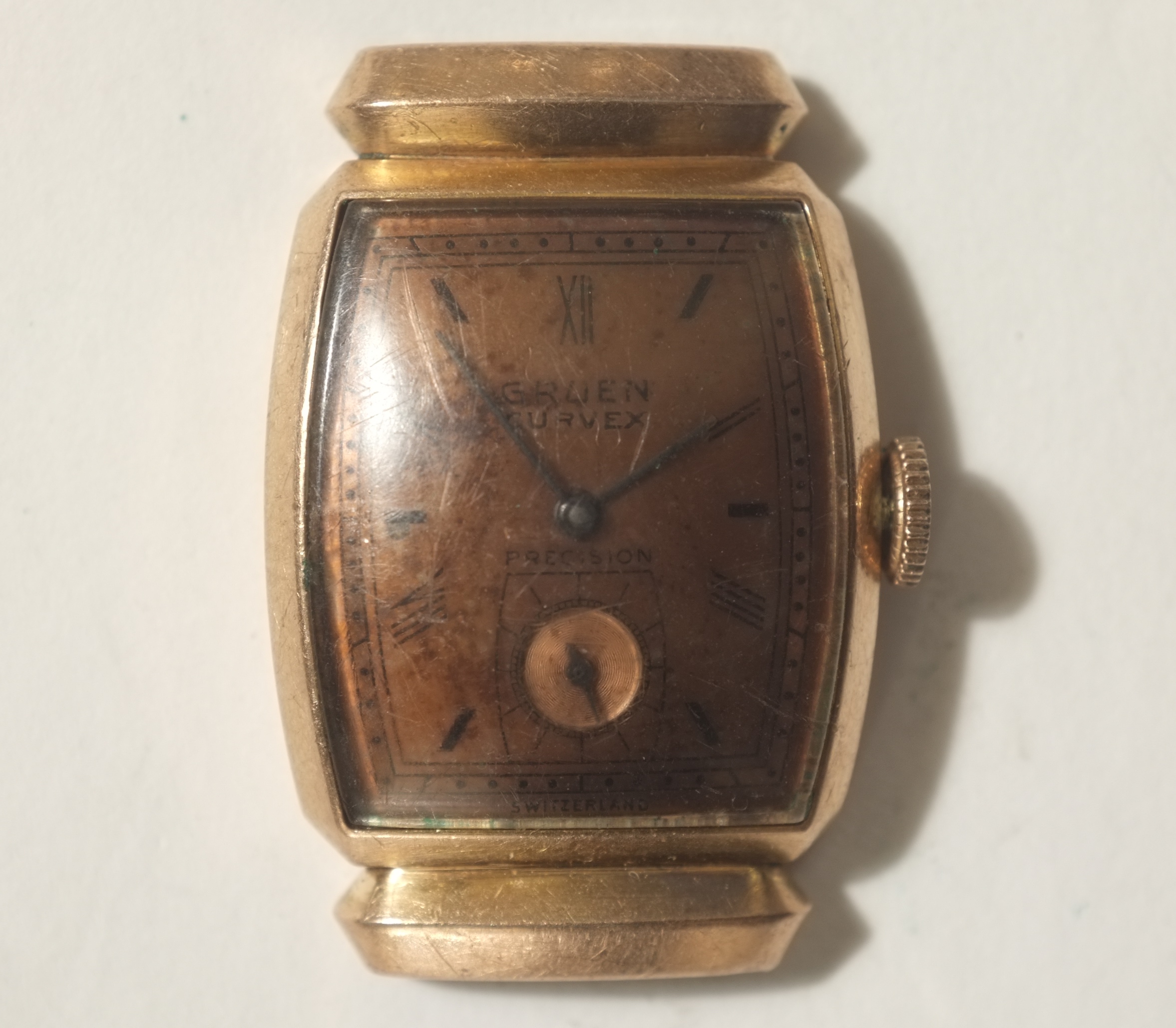 Curvex cal. 440/556 "Executive" solid 14k. Very good, not running with broken balance. Diamond dial has been refinished and missing "Curvex" text. Gold scrap value $250. SOLD
