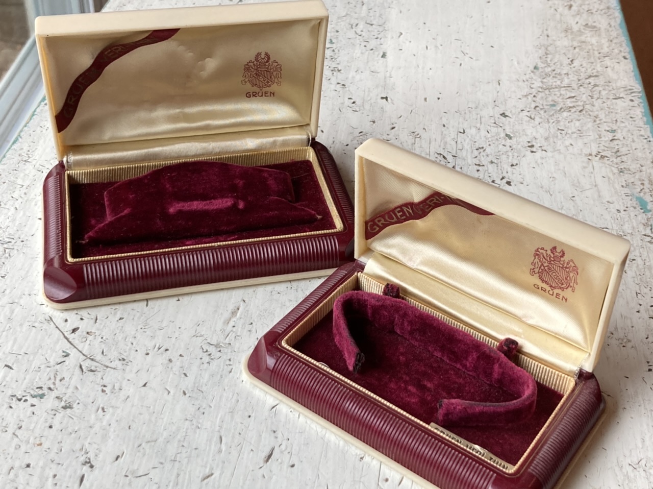 Home » Gruen Box Database » 1940s » Red & cream Plaskon boxes - ribbon identifier