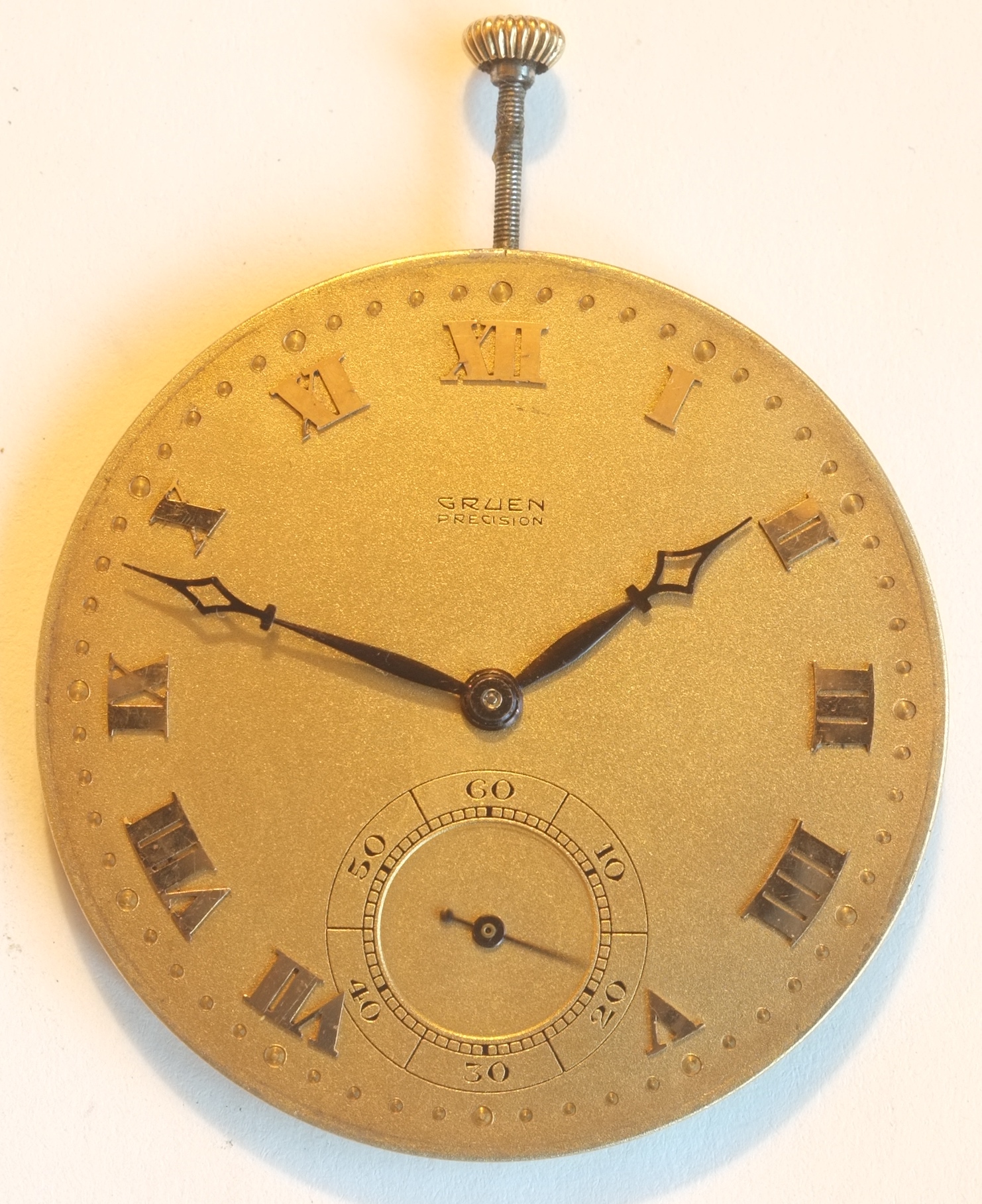 Of interest, the dial is marked with the movement serial number, and also has light cursive engraving that says "Gruen Su-" (cut off into the center hole) and then some stuff I can't make out (Gp 421???). You can kind of see it in the photo.