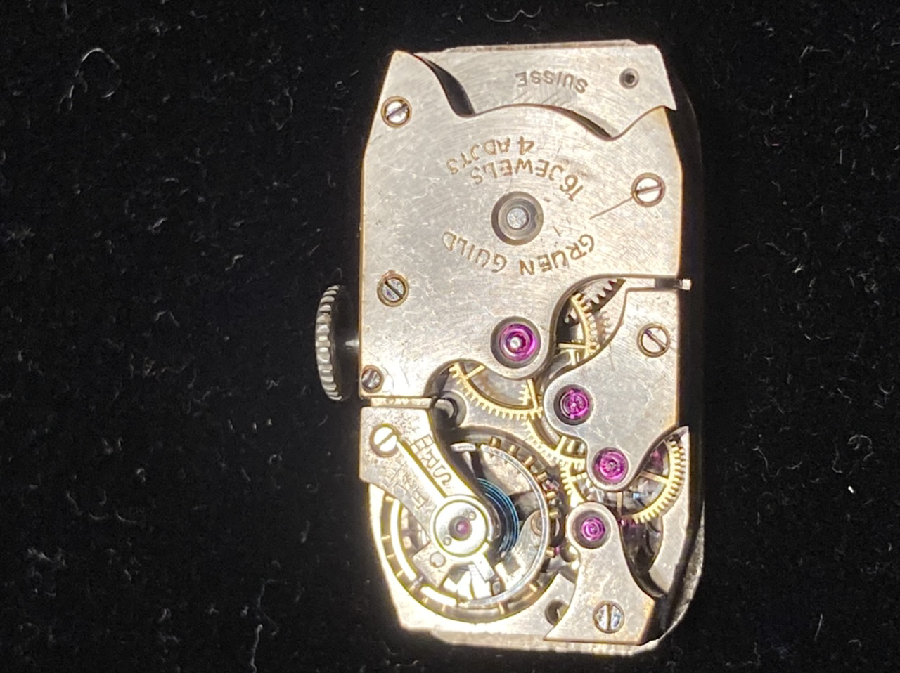 Other info: case is hinged at top and was assayed in Geneva. Last 2 digits of case number stamped on inside bezel corner, along with many hand inscriptions. Refinished dial. A clean, bright white dial was the first indication of trouble—and the print that is a later Gruen layout only makes it more difficult to ID. It should be fantasy script, I’m thinking