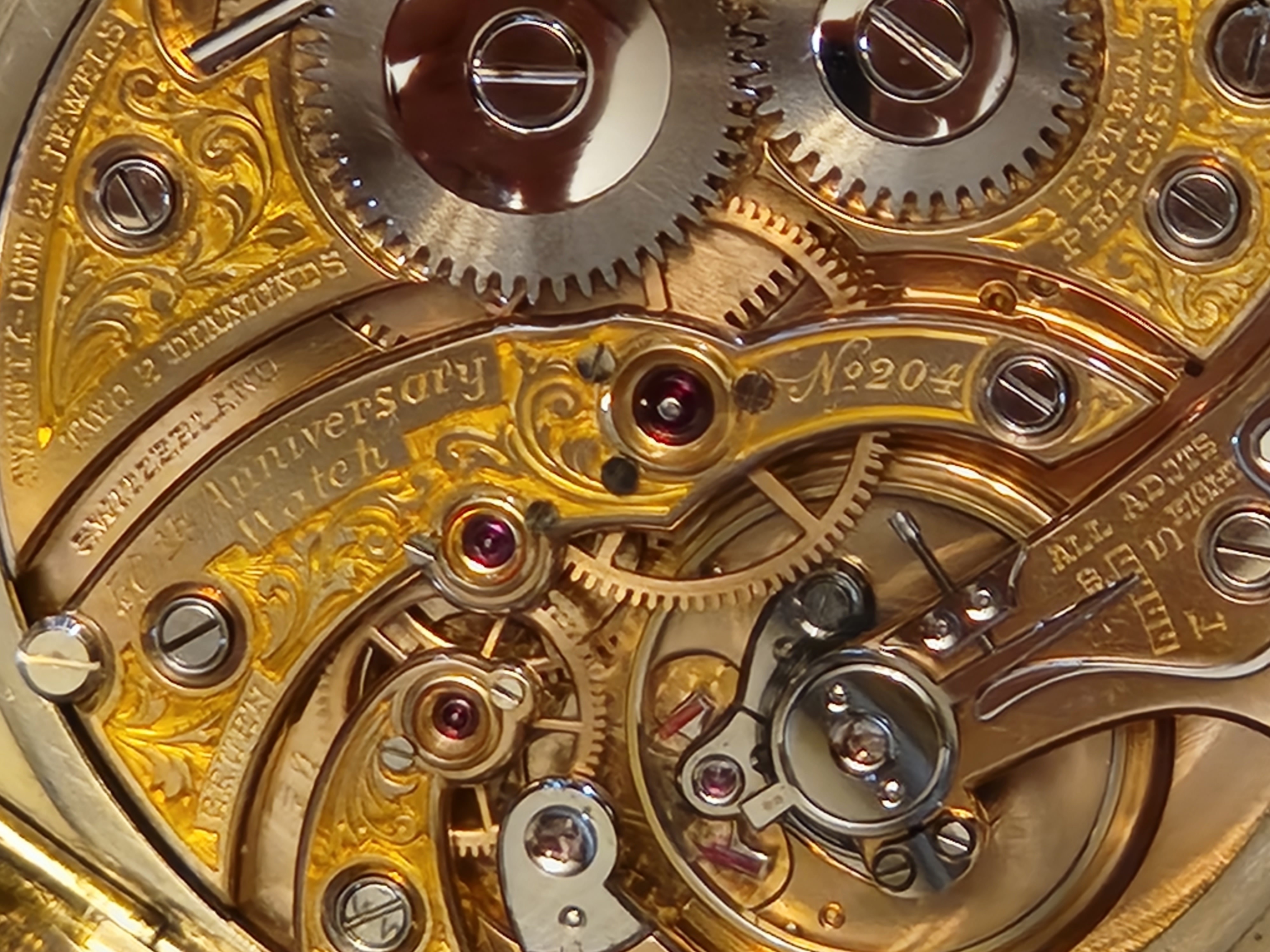 • 17-linge (approximately 10-size) open face, 23 jewels (21 extra quality ruby jewels, plus two faceted diamond cap jewels over escape wheel and balance wheel pivots on upper plates)