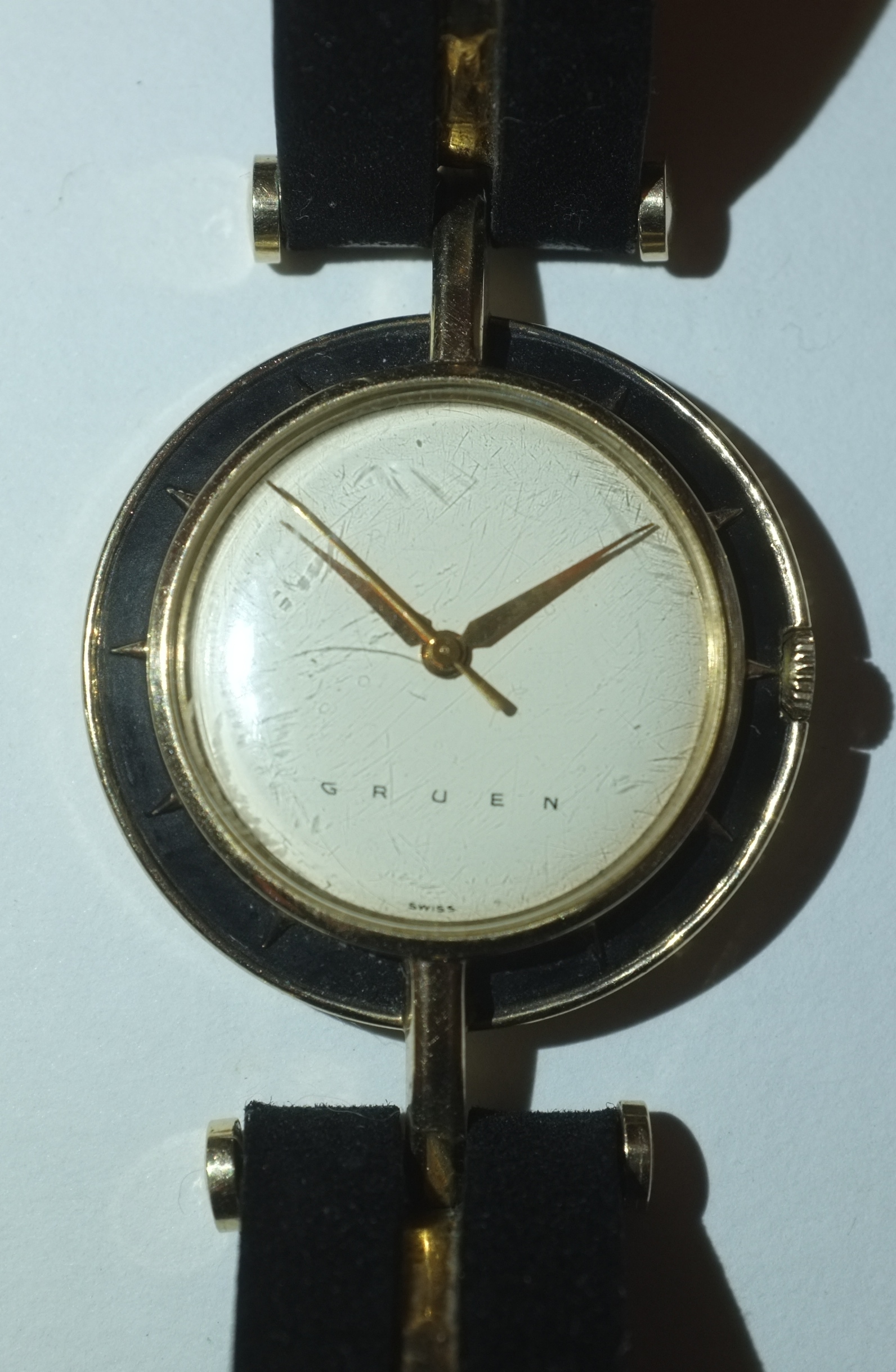 This watch had been introduced in 1957 and was part of the campaign "Gruen - The Newest Look in Time", which started Christmas 1957 and was intended to be promote for 12 month. Included were 23 jewel watches, the Continental dn Cosmopoitan serias for men, Baguette, Autowind, Caliente and Royalty series for the ladies. Most with innovative styling like this nice example. I have more about it's history and also some more ads.