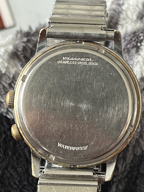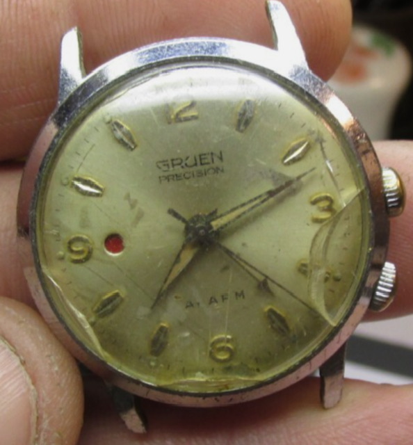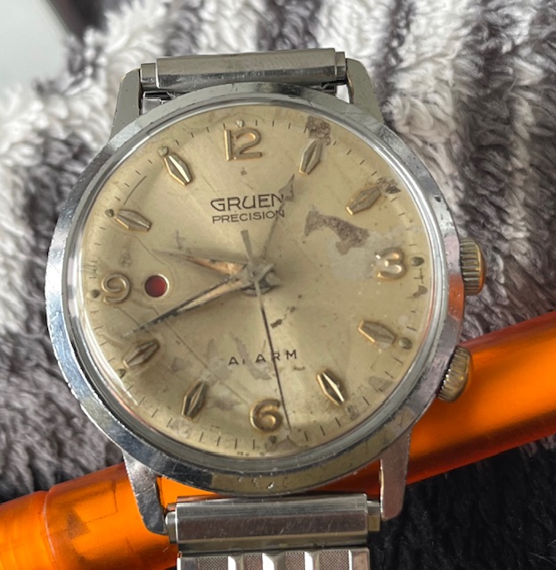 Dial has RA Swiss on it. Yup, still radioactive. When the alarm is on the dot is green, normal mode the dot is red. Unusual is only one barrel. Movement patent is 2803940 ( https://docs.google.com/viewer?url=patentimages.storage.goog leapis.com/pdfs/US2803940.pdf)