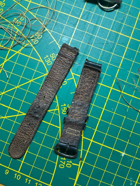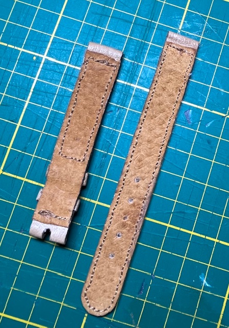 A question about the stitching on leather bracelets. On some bracelets (4 at the end of the red arrows), on the half bracelet receiving the buckle, the seams form a rectangle (dotted blue).