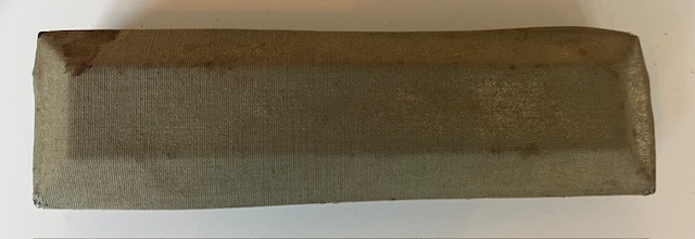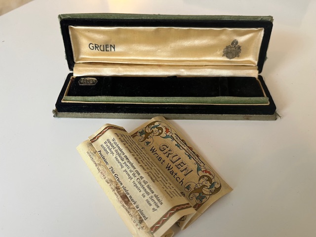 Green velvet top with black “rim”. Same in bottom. Hinged. Gruen service crest inside top. Army green bottom. Watch holder from black velvet. Dent in lid not as designed.
