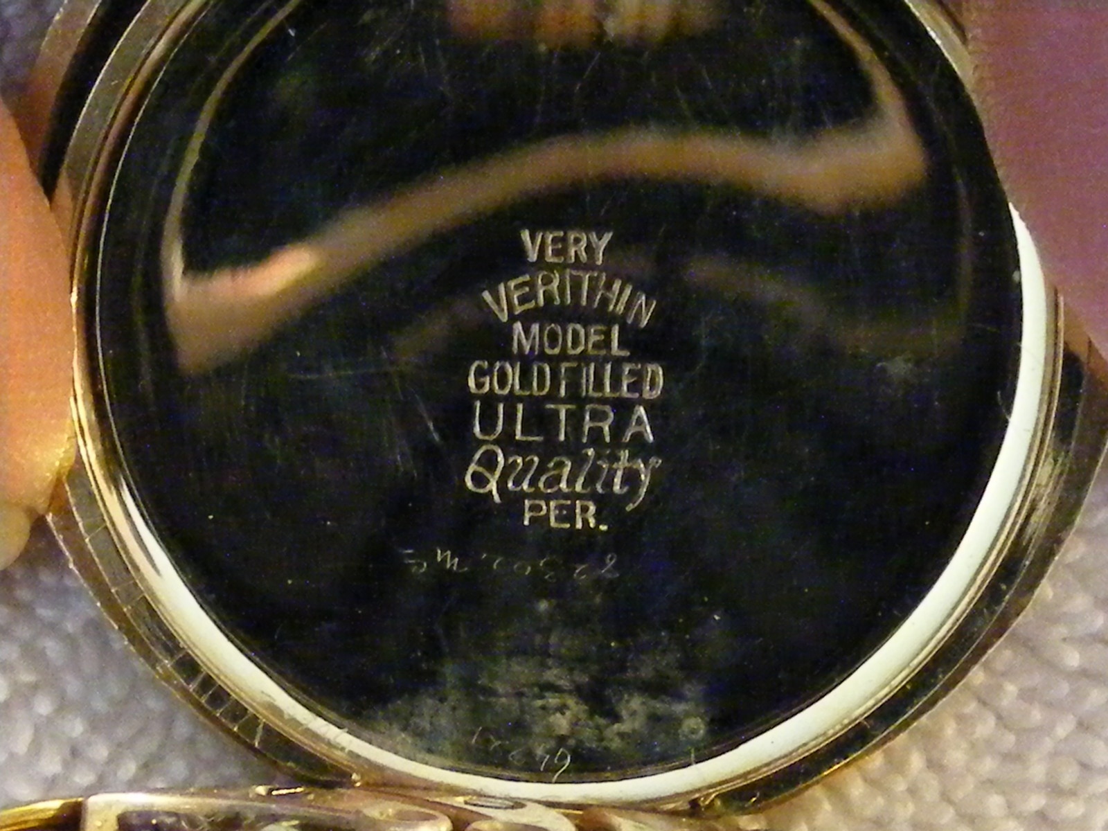 For a 100 year old watch, my guess on the date wasn't too far off for a semi-novice Very Happy It does say on the inside dust cover "Verithin Model 14K" over the serial number. Below the serial number is an 'S'. Any idea if that's significant? I'm assuming the entire watch case is 14K gold since it's inscribed as such. It was a pleasant surprise to see the insides as clean as they were. No obvious pieces missing. I've had a couple of pocket watches here and there that were downright ugly once you pulled the back off. This one looked about as clean as it was leaving the shop. I also liked the pattern of the chain, too. What would this have retailed for back in the day? Thank you both for your assistance on this.