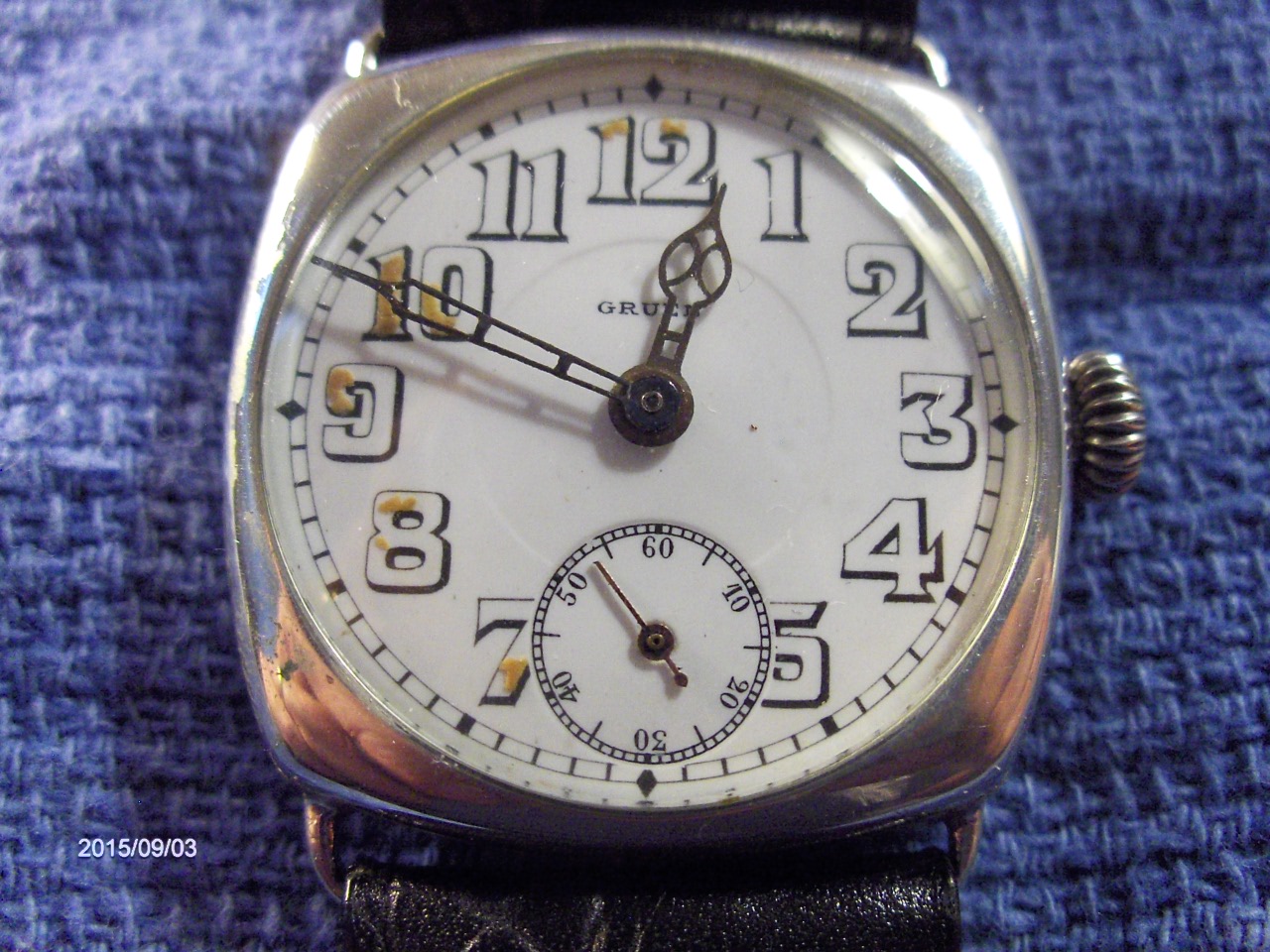 Gruen Cushion. Runs slow, just had case polished to original, dial is superb, hands are all original, should eventually have new staff. I wear this seldomly. It's about 4 minutes slow over 24, but it does run well.
