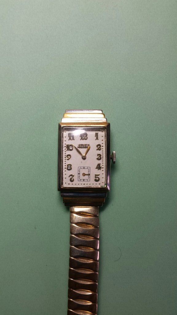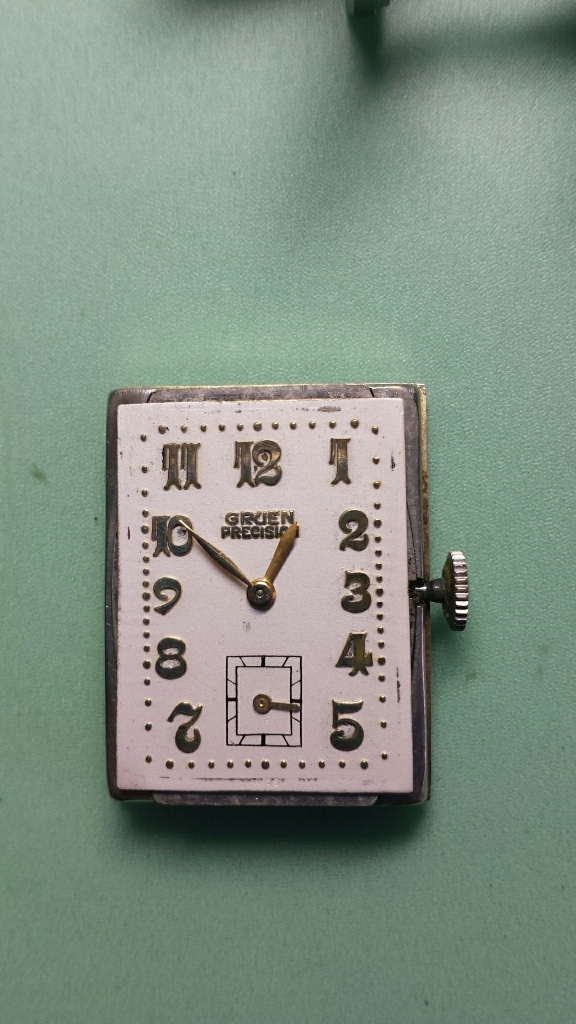 I made my way to the local watchmakers meeting this morning. I was lollygagging around with a five o'clock shadow, maybe twelve o'clock. I grabbed a cup of tea and made it in time for the mart. At the mart a fellow student and well known pocket watch guru hobbyist brought in some watches. Behold was this odd looking Gruen in the mix. The white/yellow gold mixed case looked odd, didn't look like the typical Gruen case. The price seemed good so needless to say I bought it.