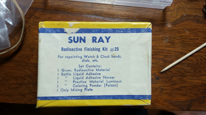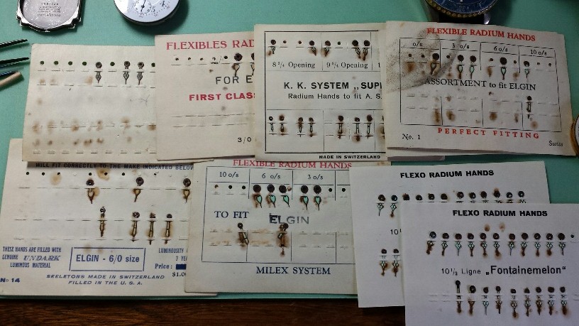 There was this parts table at the regional that was in the middle of everything. They had a ton of everything imaginable in parts... I stopped by several times while selling tickets, to scavenge through it was like seven 11 "Too Much Good Stuff". I saw the radium hands and some packages that had the fontainmelon hands, good ole factory "T". Near the end of closing I went back and said I'll take the assortment of raduim hands, how much? Take them he said and lume them with this stuff. ;-)
