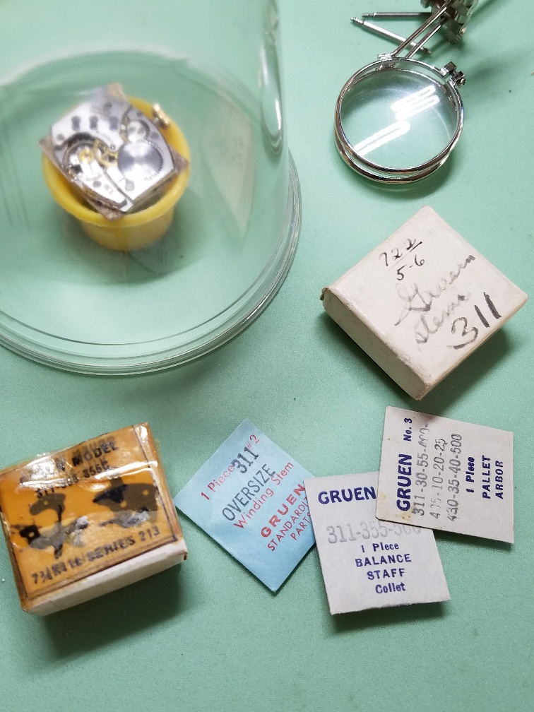 Welp, thanks for the offer, but the one I have starts and stops, and is driving me insane. I found another hairspring from a 500, and that works nicely, but the watch still stops on me. Before, the watch was terribly slow, and of course, the hairspring was toast. I would really like to get a good running 311. I am going to tear this one down again, and see if I missed something........scratching my head here!!! I may be able to use that oversize winding stem. I have another parts movement that may be able to be brought online if not for the worn out place on the movement where the stem rides.