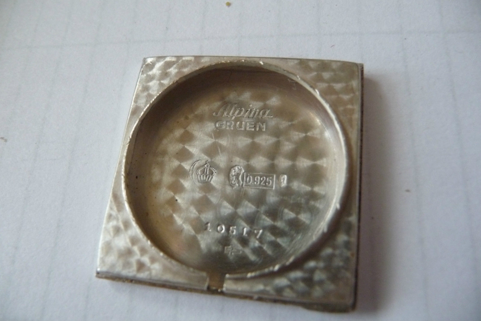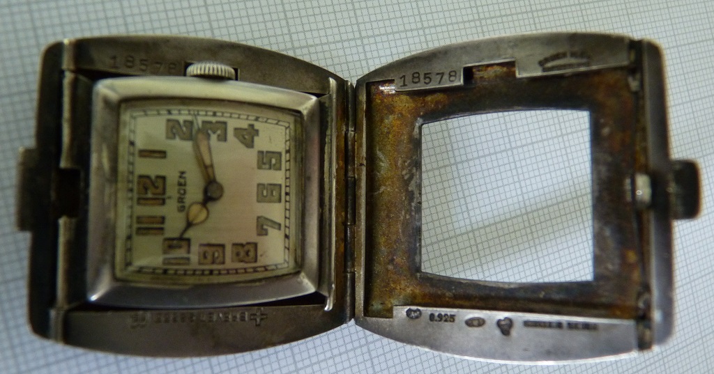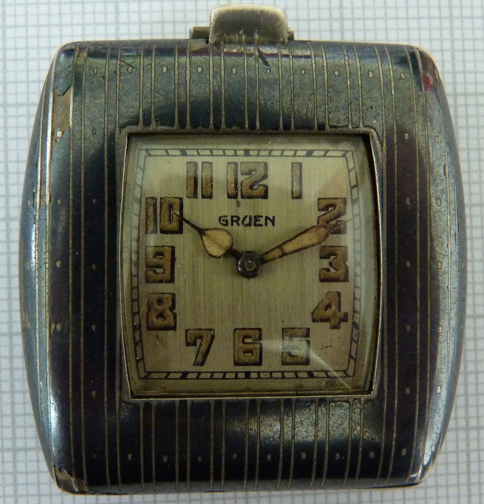 The case is stamped GRUEN W. Co. twice, the dial says GRUEN and the movement GRUEN GUILD, so it is all authentic for a true Gruen. The hallmarks in the sterling silver case are for the Huguenin frères Niel factory in Le Locle, there is also a patent mark with the #98835 in the case which is the patent for such kind of folding case for this case factory. It was filed for in 1922 and issued in 1923, so 1923 is the earliest possible date for this watch. The 885 movement would put it towards 1925 or later. The watch is not mentioned in the 1927 or 1929 Guild books or the 1931 amendment so I tend to believe the watch might be from 1925 or 1926. Any thoughts about a date?