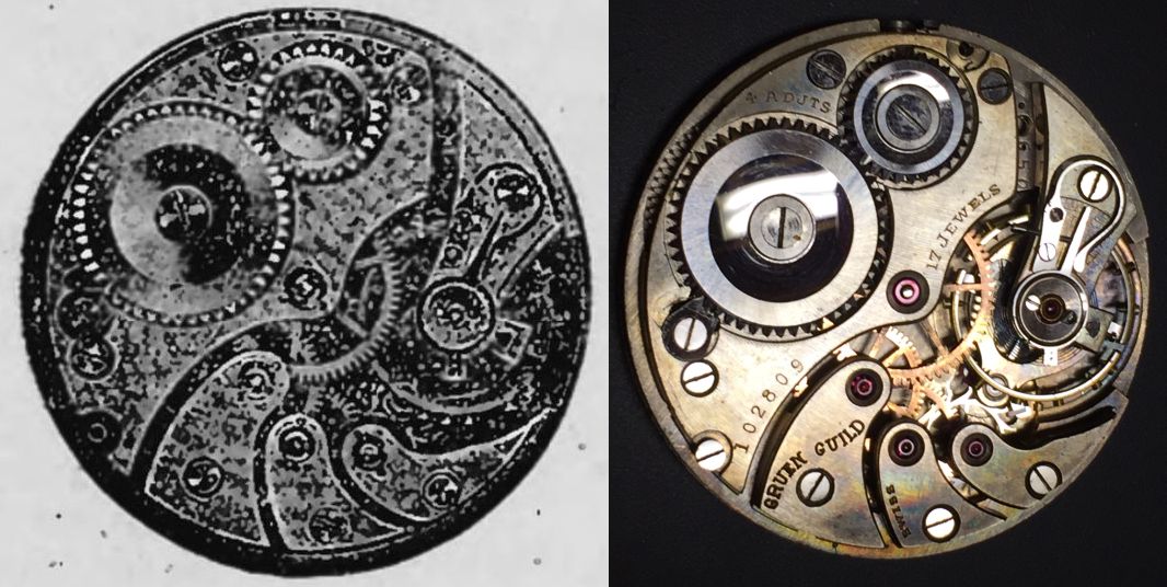 Some mentions of this caliber recently, so wanted to share 2 examples in hopes of learning more about it. This caliber appears to have been introduced at the end of 1920/beginning of 1921. When first introduced, it had 4 adjustments, and the serial number stamped on the bridges, in addition to identical sn on the front plate. The earliest Gruen version I’ve seen is sn 101874 that recently sold on the bay—this may have been a first run for Gruen. The earliest cased version I’ve seen is sn 103037 (still w/4 adj & bridge sn), in Gruen/Wadsworth-signed Ultra Qual case # 360419. That puts it at mid-1921, which along with the caliber # stamp on all examples I’ve seen is why i say it may have gone into use in 1921, with first production maybe at the end of 1920. The serial numbers accelerate quickly, seemingly far beyond Gruens usage, so likely it was the common maker’s sn series, not exclusive to Gruen. Hoping others can share any similar examples.