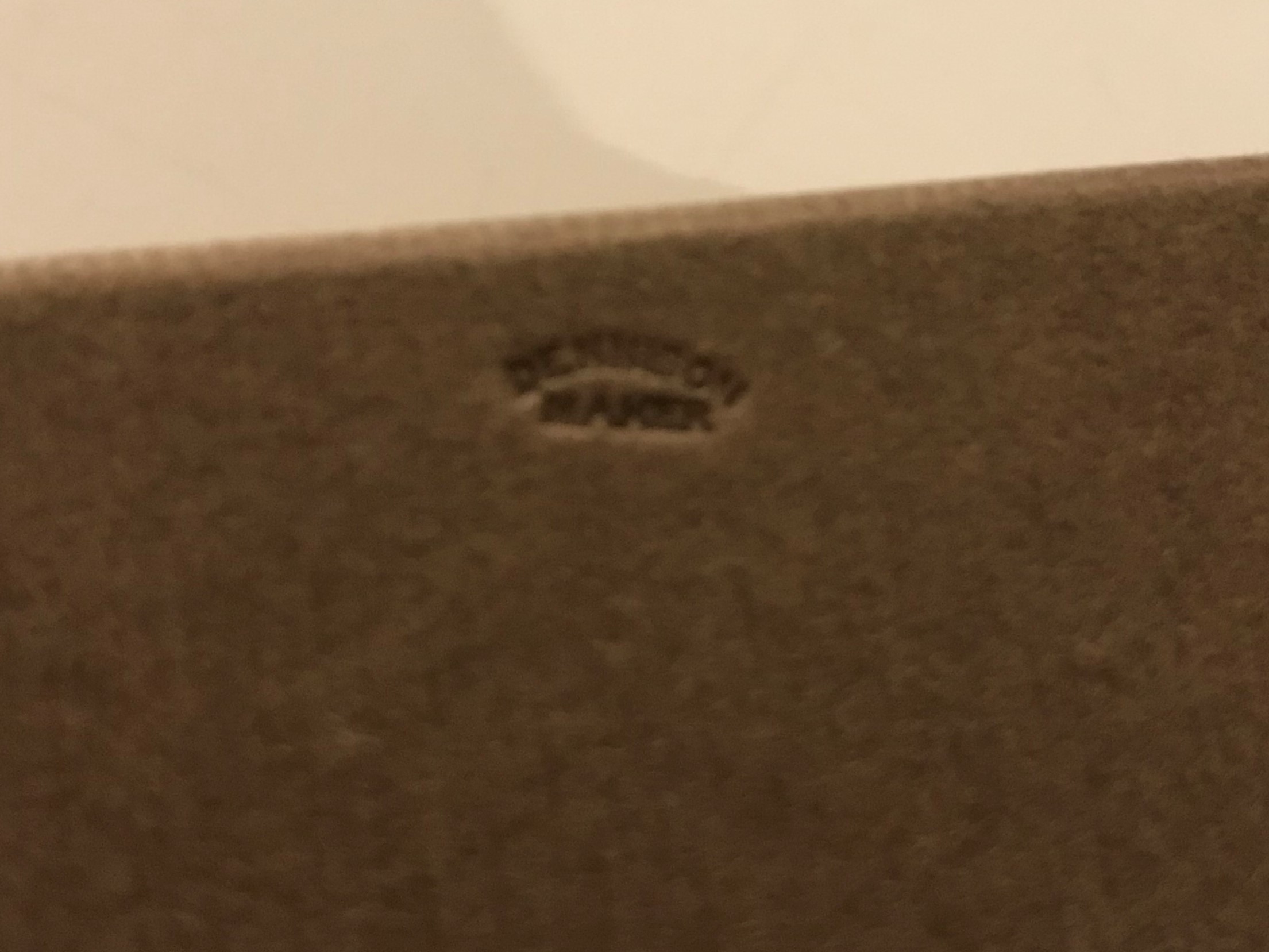 Impressed in the bottom of the inner box is “Dennison maker”. The Dennison Mfg. Company started in 1844 when Aaron Dennison (a Boston jeweller) began to make paper boxes. His father (Andrew) and he made a machine to facilitatie the making of cardboard boxes. At the time most jewel boxes were imported. In 1863 the company produced lots of paper stuff (jewelry tages, display cards) and in 1914 crepe paper. One of the sales offices was in Cincinnati. Today the factory still exists in combination with Avery.