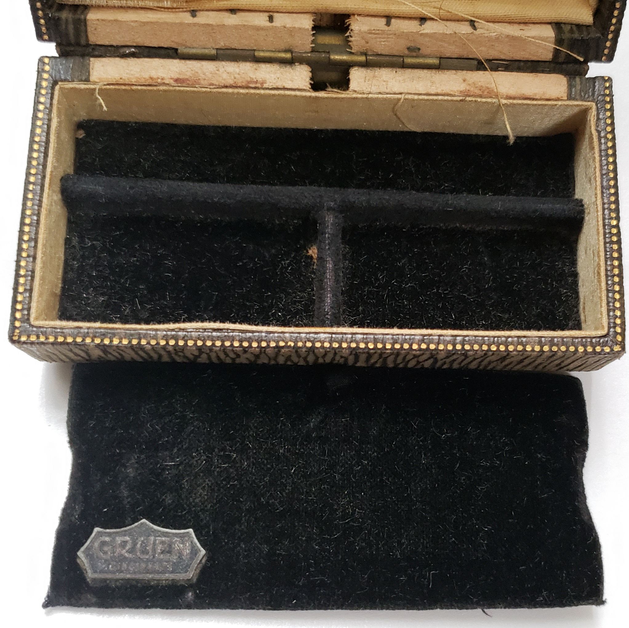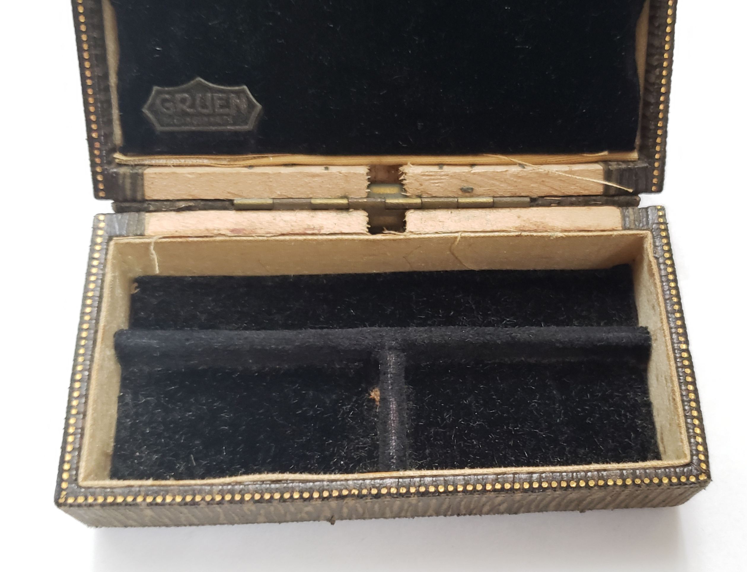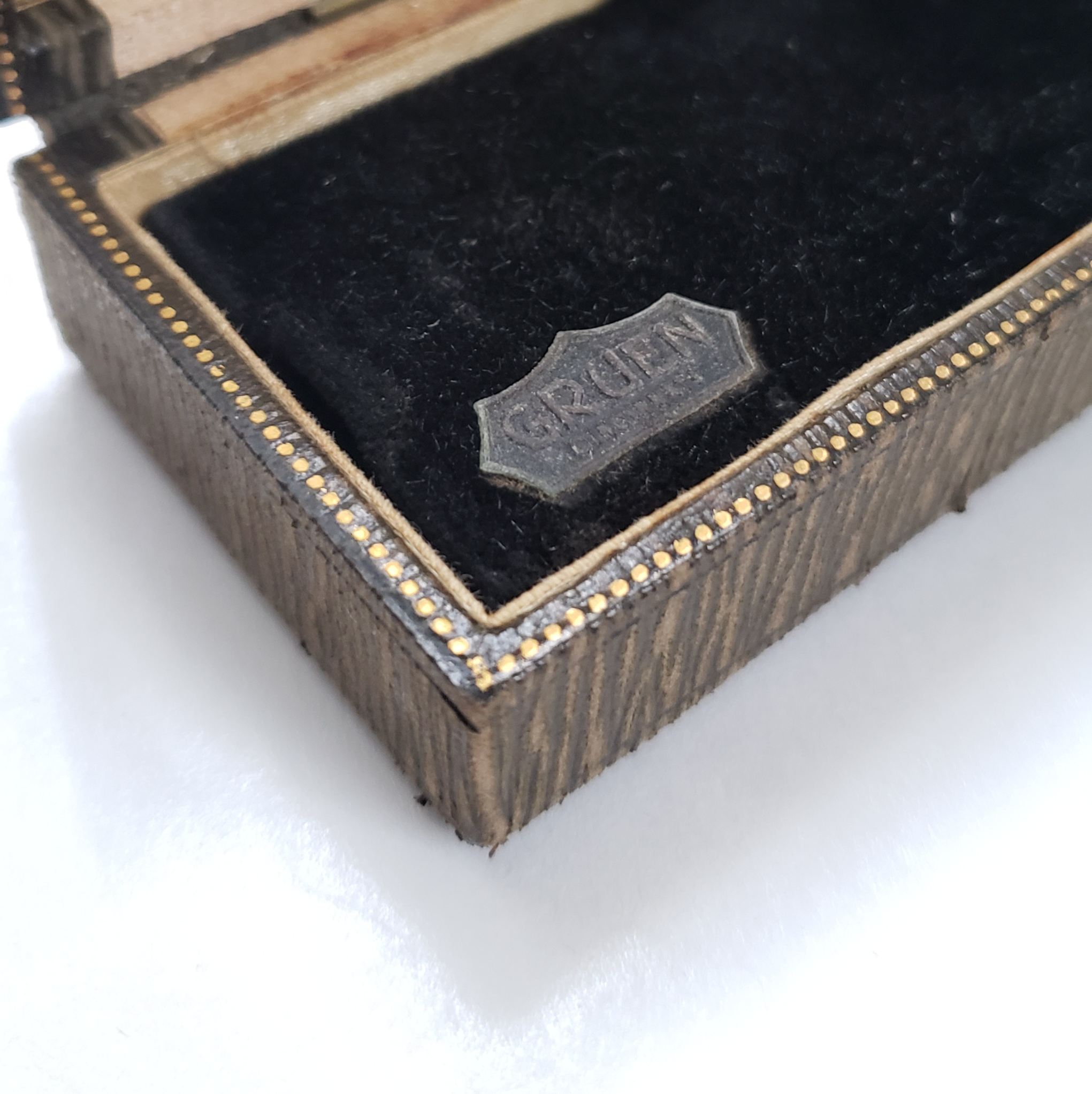 Second, even though this box is green...Gruen filed for trademark the color scheme in 1923 of brown outer box, inner black bottom, inner gold top, and gold trim on edge claiming use back to 1913. Past examples of "claims use" in patents have turned out to be accurate. Brown, gold, black is a Gruen signature.