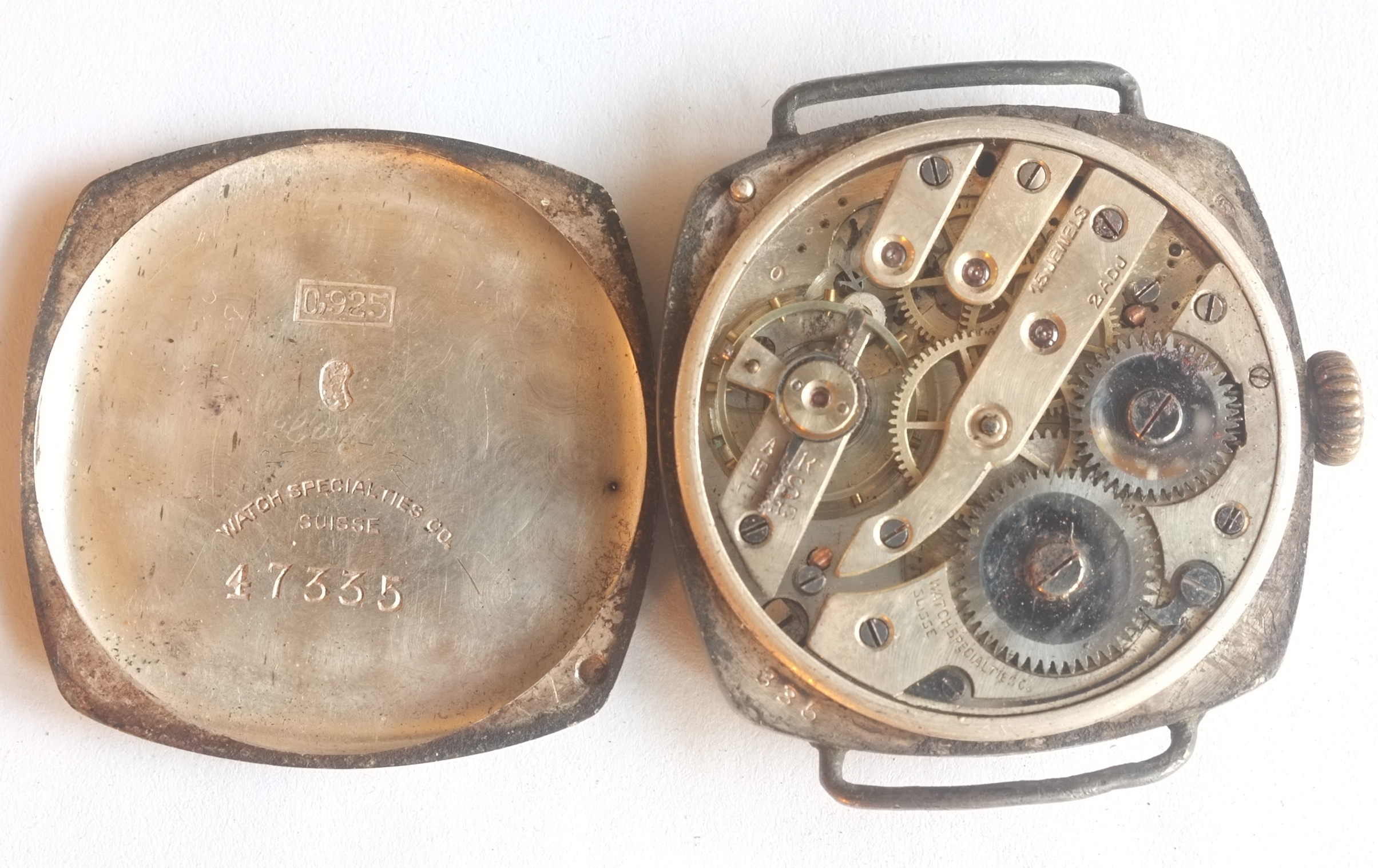First, an early WSC trench watch. It has a good balance, but rust on the hairspring - and when I wound it, the hairspring broke after a short time running! A first for me. Setting is frozen, and I didn't want to force it. The back is dished in, but still snaps on tightly with no edge gaps. No crystal or minute hand. Great for parts or could be revived with a donor hairspring. Sold