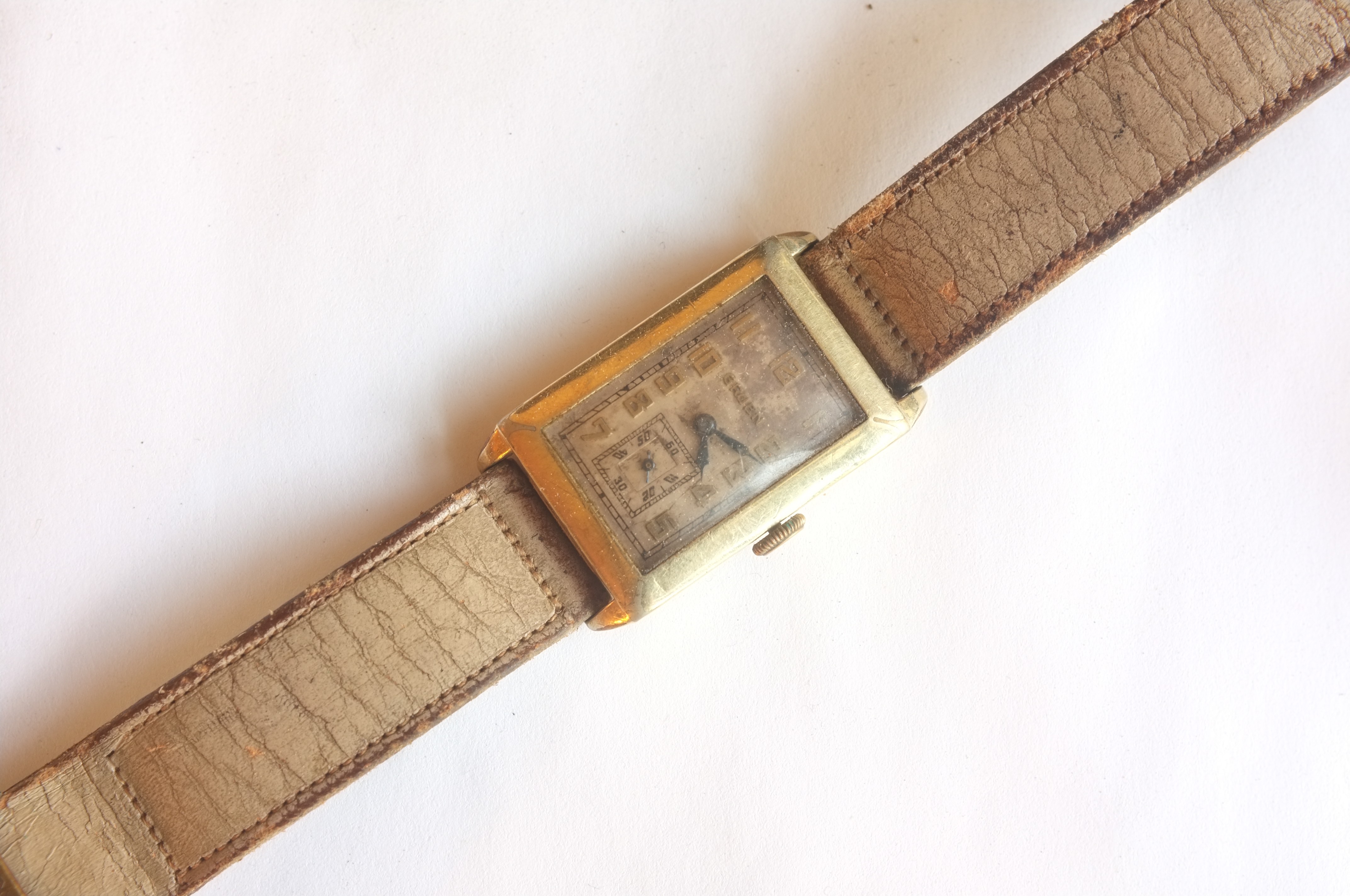 Third, a Quadron, 157/8, on a vintage leather band. Not running with a broken balance. Everything else is good. The back is not worn through the gold; the front is worn on the corners. The dial looks original but has issues, as you can see. Sold