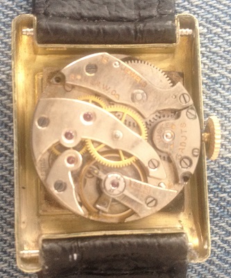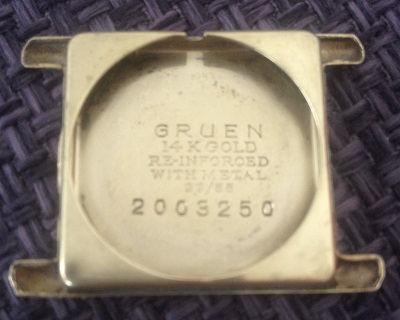 Despite looking like it saw plenty of use, it looks like there's no brassing on the case, right? And I've noticed that on the handful of other gold filled "Tank" watches I've seen. These cases seem to wear exceptionally well. I have a couple of theories about that. One, probably the most obvious and probably correct, is that the way they're stamped - with almost all rounded contours, and not many sharp angles - causes them to wear well, since the gold layers are usually stretched thin around sharp angles. The other theory is that maybe the "14k gold reinforced with metal" really means something on Gruen's in-house gold filled cases. The marketing materials describe a thick gold outer shell with a base metal interior. Having handled a lot of "reinforced" Wadsworth cases over the years, I'm inclined to say that they're really nothing more than conventional gold filled, or close to it. Perhaps there's more of a difference with the cases Gruen made themselves. But I've never had one to see in person myself.