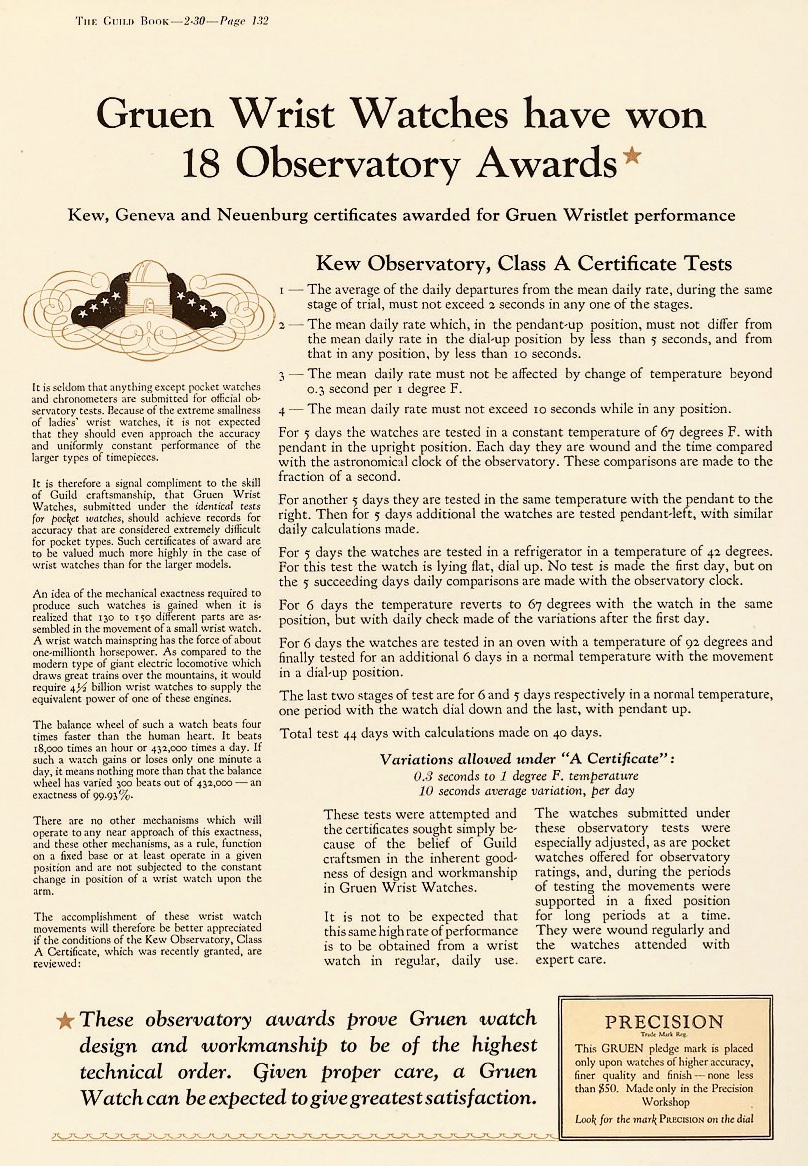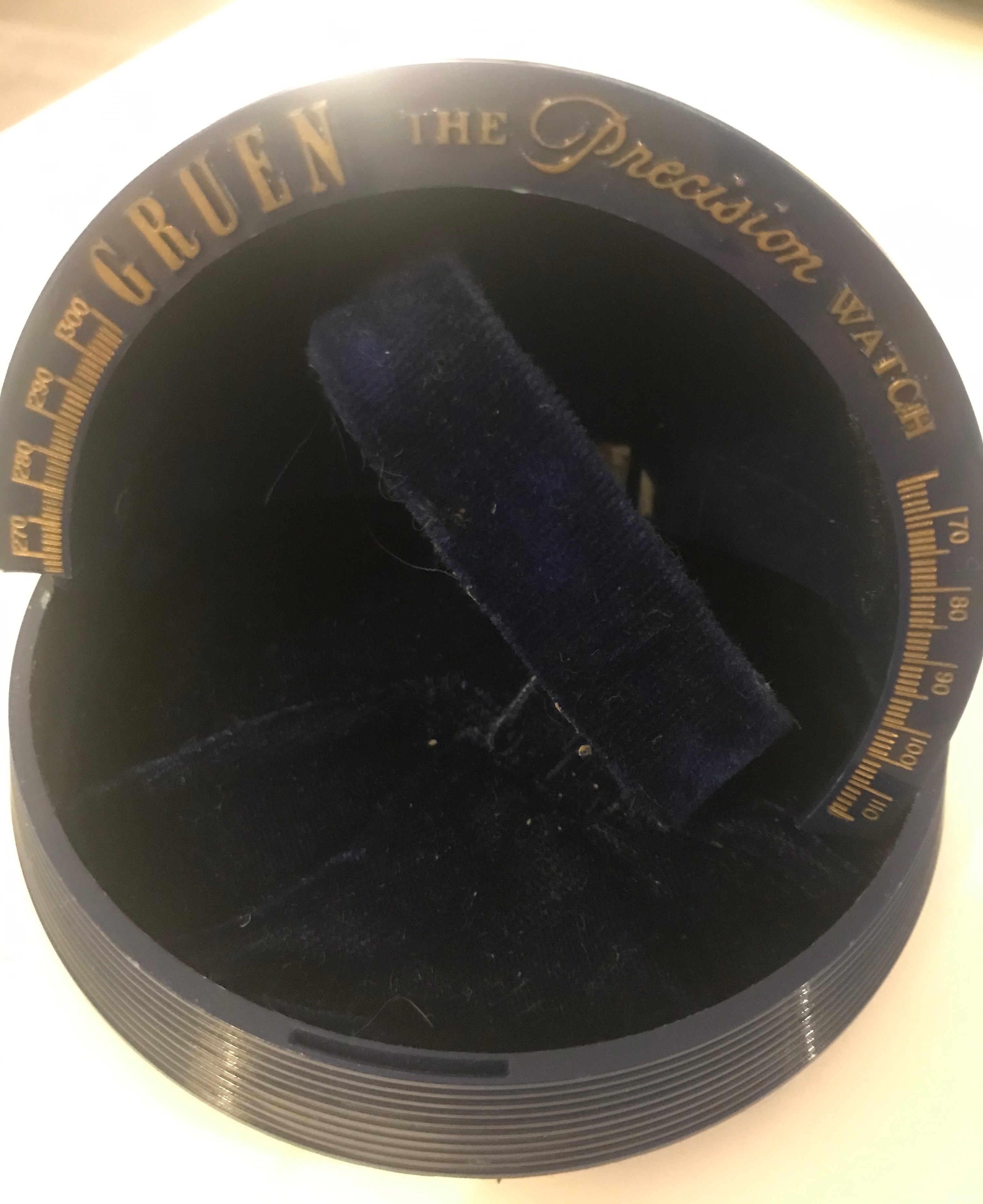 From 1935 gruen switched from guild to “the precision watch”. In 1938 same lettering for Gruen started. In 1939/1940 the crest disappeared in the ads. In 1939/1940 Precision lettering was more graceful Looking (like on the box). In 1941 you see trademark behind precision. Trademark disappeared in 1948. In 1950 the precision writing looks different again.