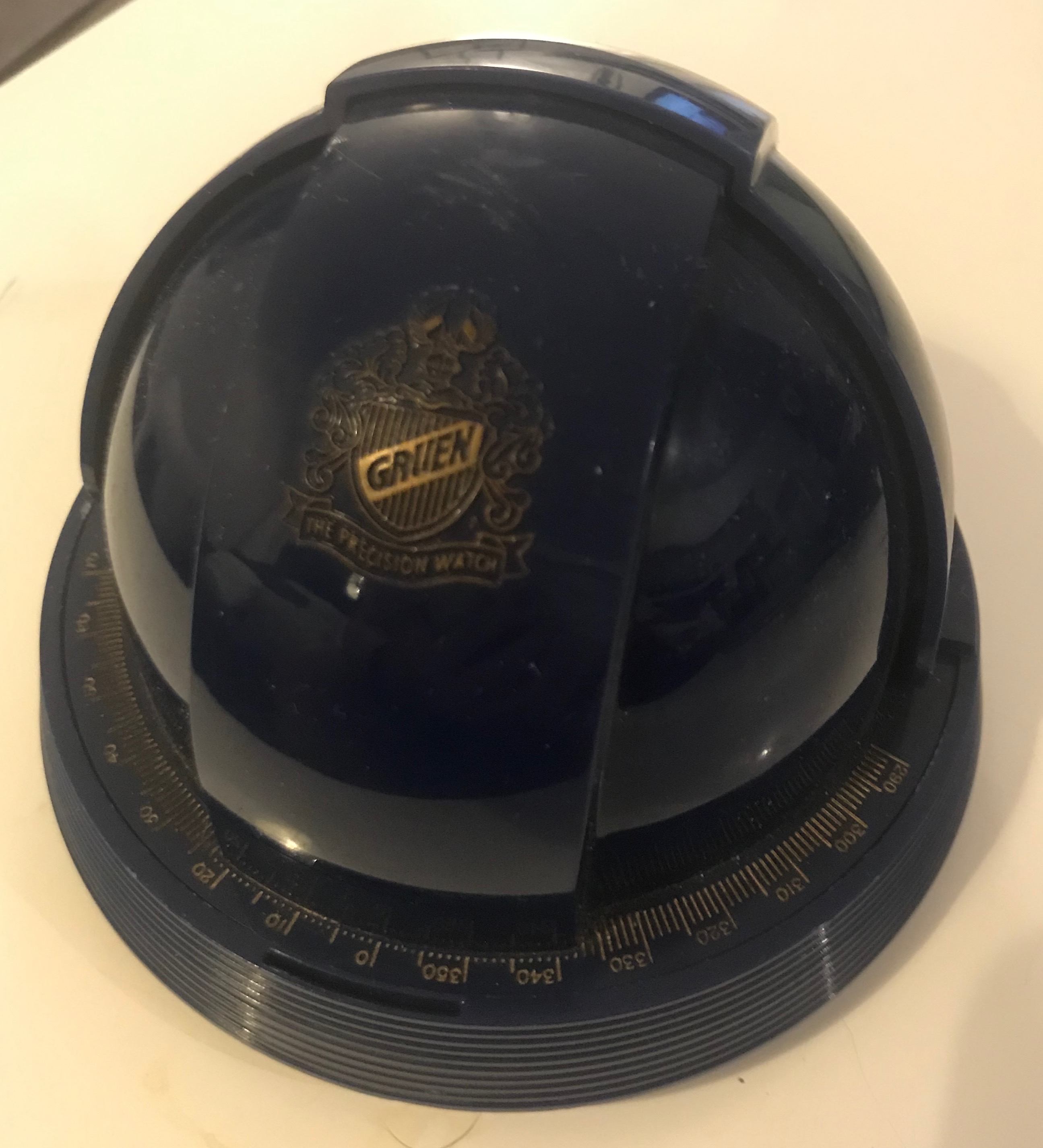 Blue box in the shape of an observatory. With text Gruen the precision factory, measurement marking and a gruen crest. Underneath Gruen Time Hill, cincinnati. Made in USA. Blue velvet insert with watch holder.