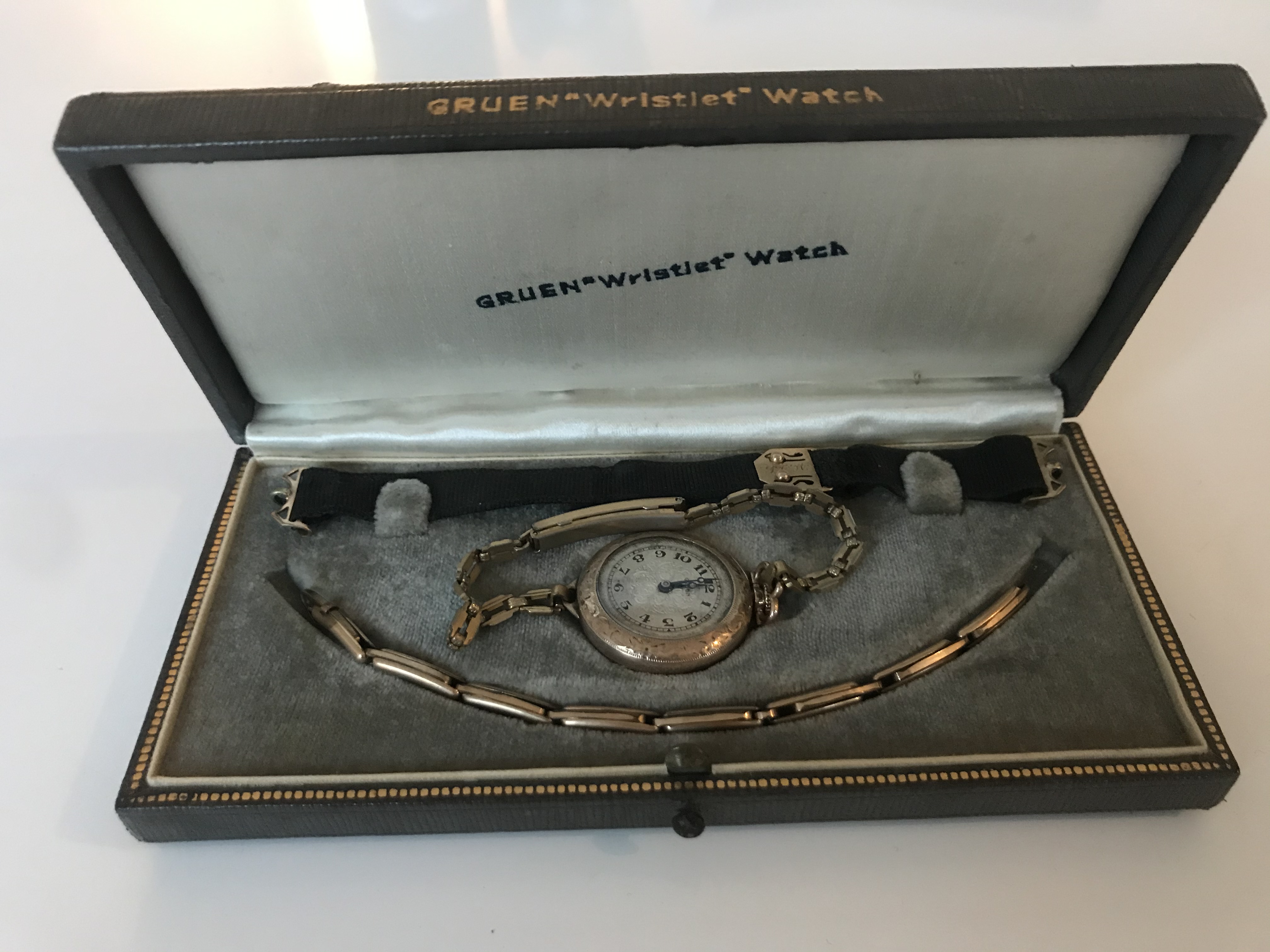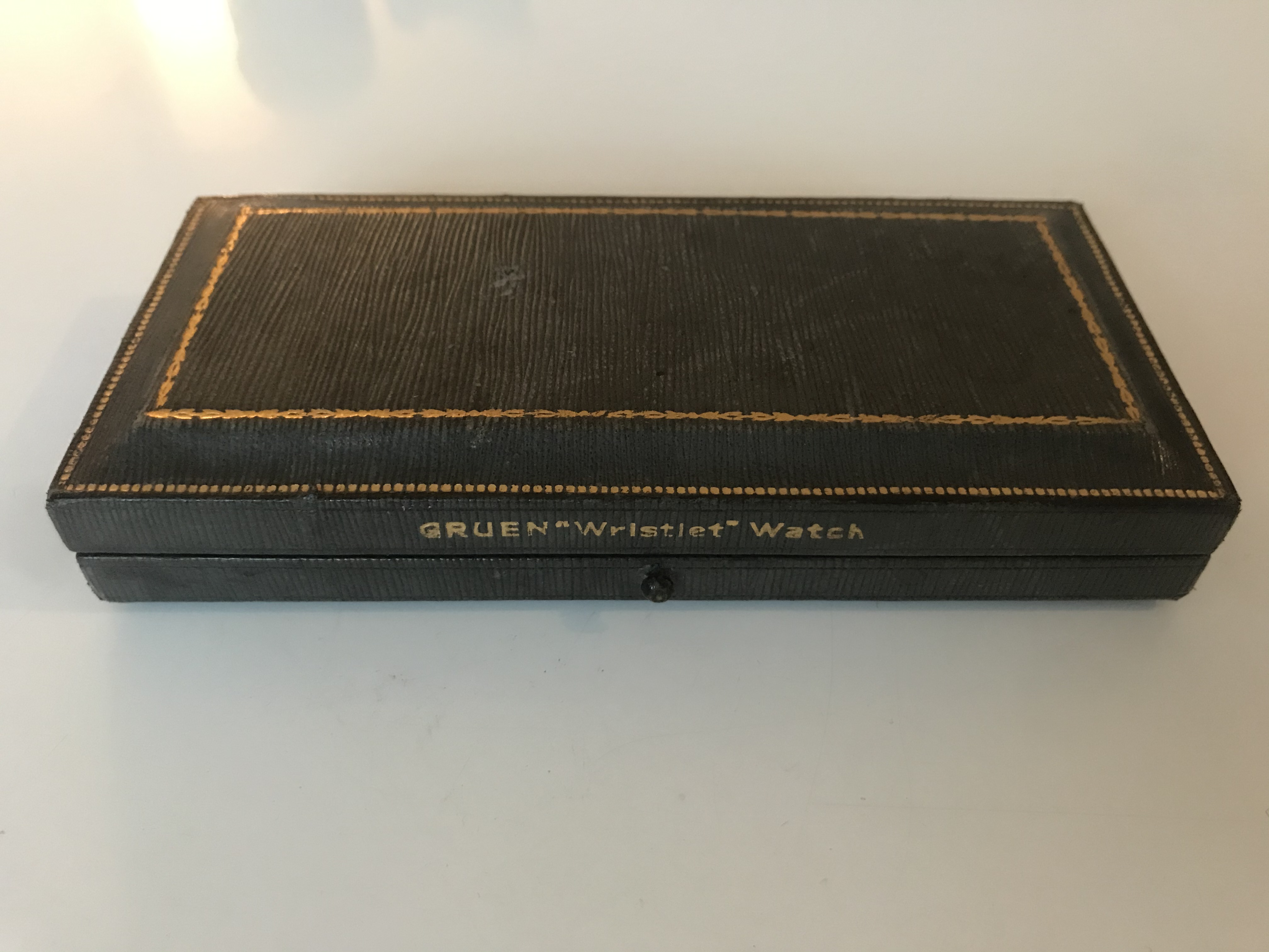 Fake leather wooden box in greyish/taupe color with a gold print. Also the text "gruen wristlet watch" on the front side. Has a metal push button to open te case. Inside the case there is a greyish velvet holder for a convertible watch, smal metal strap and ribbon strap. Has silk in the lid stamped "gruen wristlet watch".