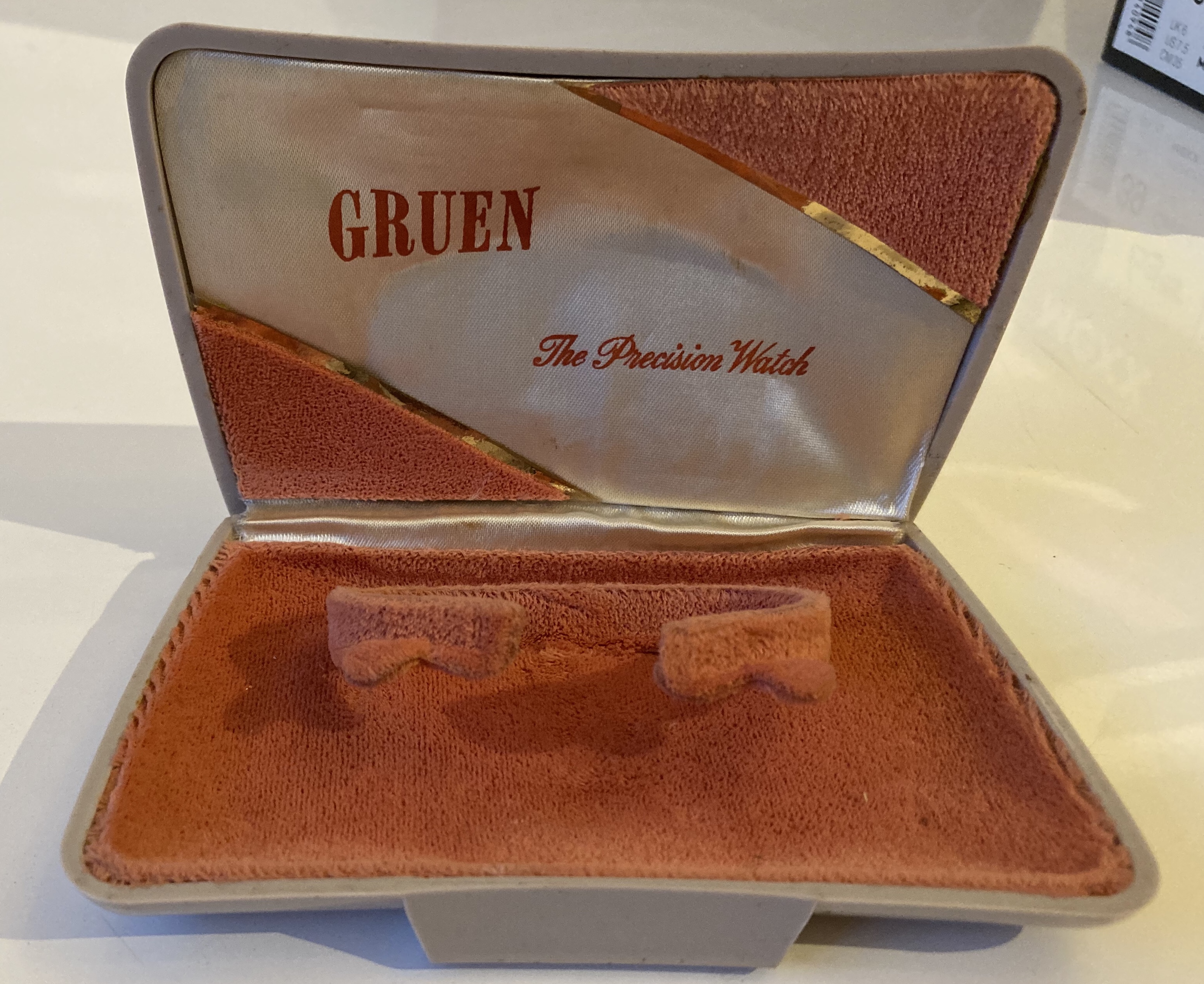 Home » Gruen Box Database » 1950s » Grey plastic BCN ladies with salmon velvet inside