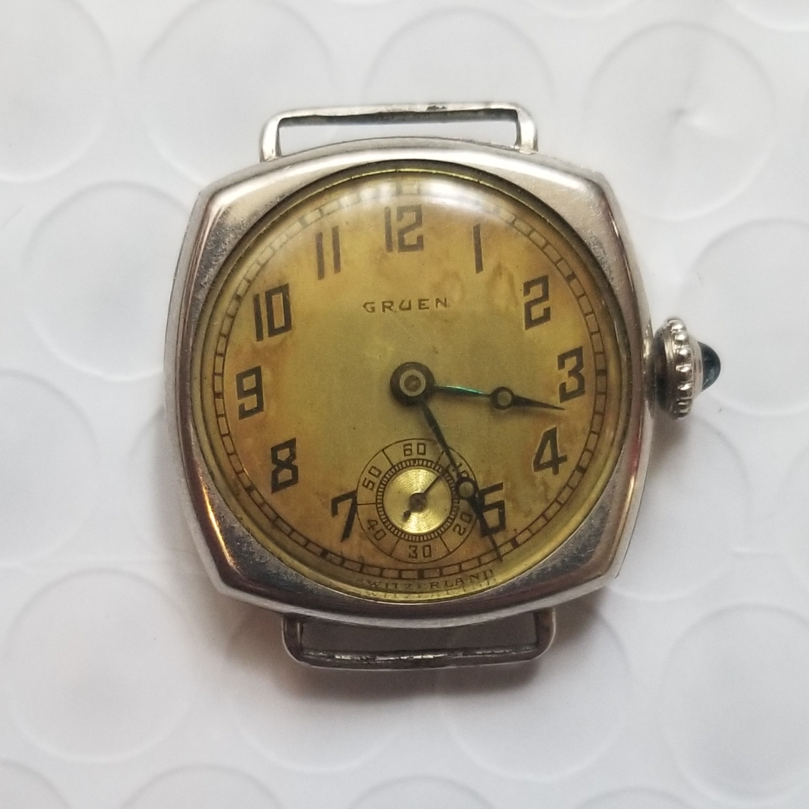 Here's my shot at dating it with case #s. The case was likely made mid/late 1925 and I believe is actually an unsigned Wadsworth case. Many of the Ultra Quality line, including these and the tanks, remained unsigned long after gf/reinforced cases started being signed, but they follow wads case #s, including the jump to 5mm in late 1925/early 1926. This case was made either just prior to that jump or maybe even concurrent: it appears Gruen built up a large stock of GF Quadrons right at the 5mm jump, occupying much of 5-5.1mm.