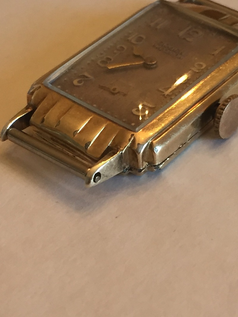 Peter removed the poorly constructed lugs that had been soldered to the case. He also refinished the case. These bars are quite susceptible to being levered off. Pretty sure that is what happened to this watch. I've also seen this repair on other versions of this watch on eBay. FYI.... Bruce's is one of two I've ever seen with the original lugs on.