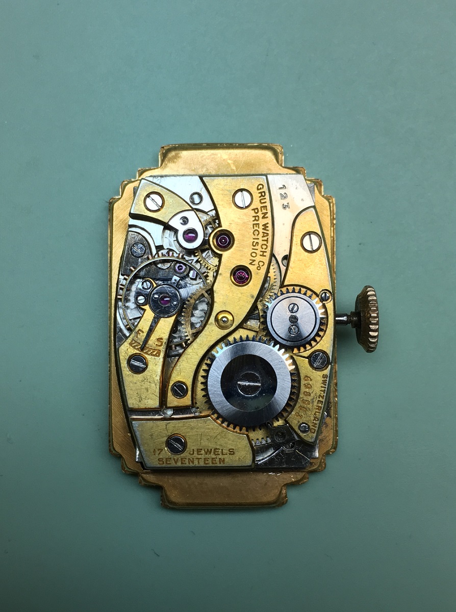 The earliest 123 I have recorded is from mid-1929, Gruen case # 1304645, right before the Gruen house case jump to 2mm, one of the first cases marked "movement adjusted in USA," although movement still marked "adjusted temps" (correction: it's not marked for adjustments at all--had to double check, after learning more below. It's sn 700430). Bridges already gold, as were all later ones I've seen.