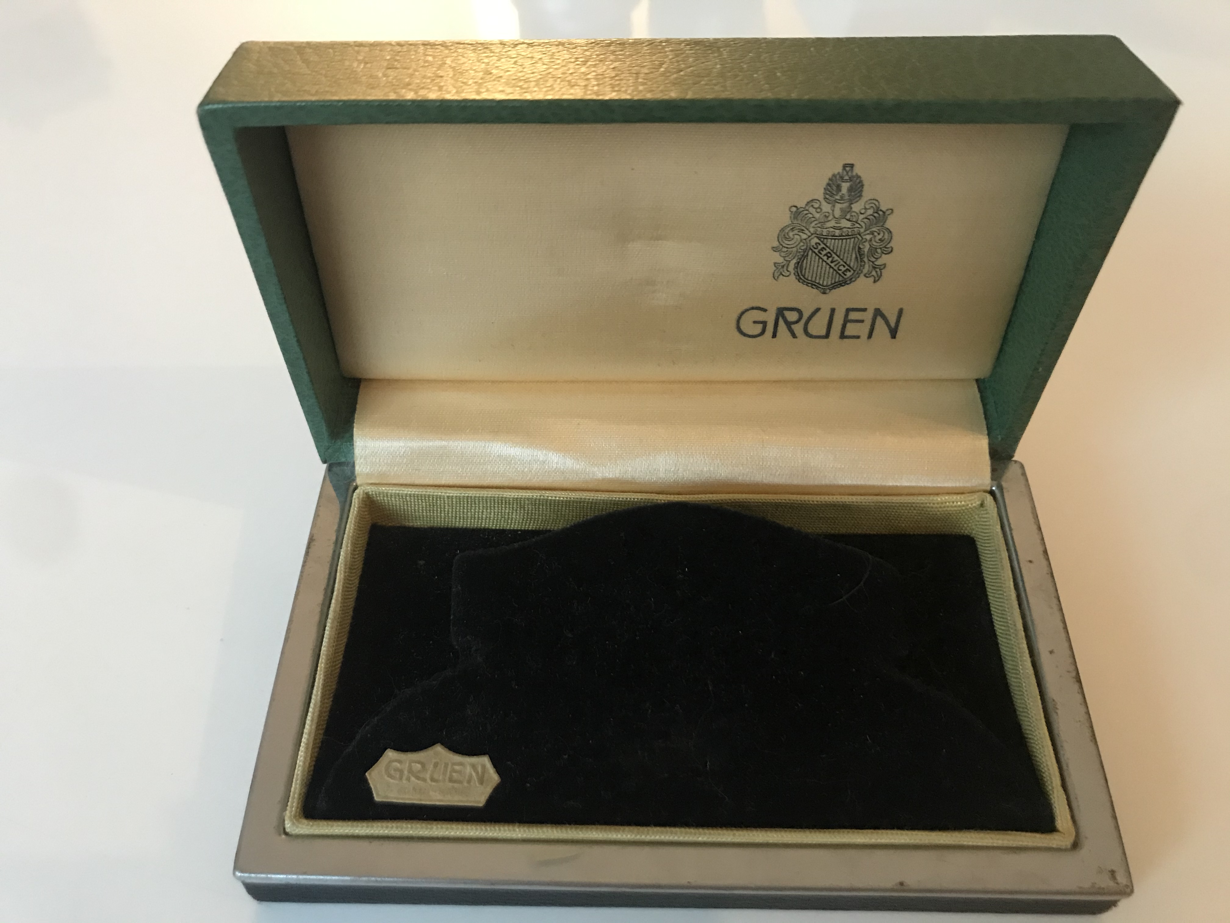 Gruen top and black bottom hinged. Silver rim. Watch display holder from black velvet with Gruen cincinati label. Booklet Gruen watch guild workshops guarantee (A198 43550). It says "over 60 years" in the manufacture of fine watches--> 1874+60=1934