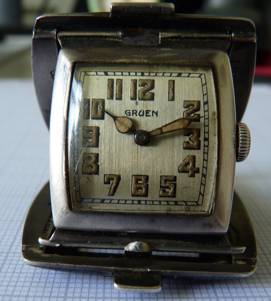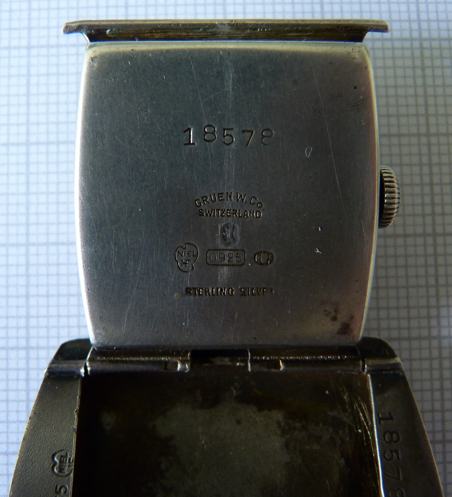 The case is stamped GRUEN W. Co. twice, the dial says GRUEN and the movement GRUEN GUILD, so it is all authentic for a true Gruen. The hallmarks in the sterling silver case are for the Huguenin frères Niel factory in Le Locle, there is also a patent mark with the #98835 in the case which is the patent for such kind of folding case for this case factory. It was filed for in 1922 and issued in 1923, so 1923 is the earliest possible date for this watch. The 885 movement would put it towards 1925 or later. The watch is not mentioned in the 1927 or 1929 Guild books or the 1931 amendment so I tend to believe the watch might be from 1925 or 1926. Any thoughts about a date?