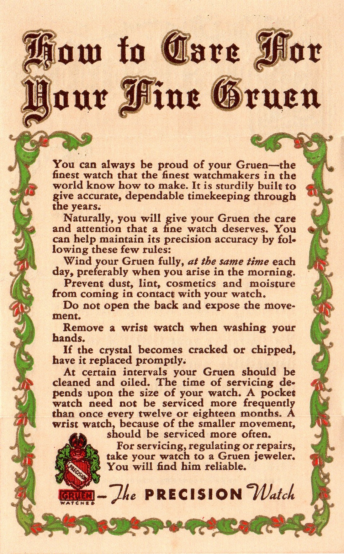 This box was used for the Victor and Victoria series which was introduced and heavily promoted in 1936 being the market opener for smaller watches after the baguette era for the ladies. The outside came in red and black velvet covering the wooden box. Just like the green box it has a polished metal rim at the opening. Gruen writing on the silk like inner cover comes in a modified font, also the crest has been modified over the slightly older green box. Not known if there were other watches of that time coming in the same box.