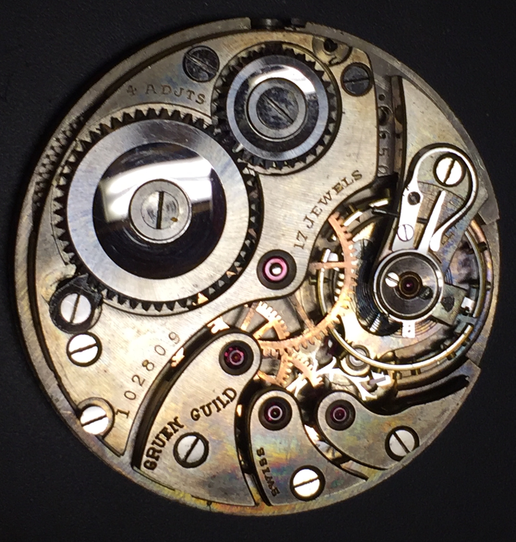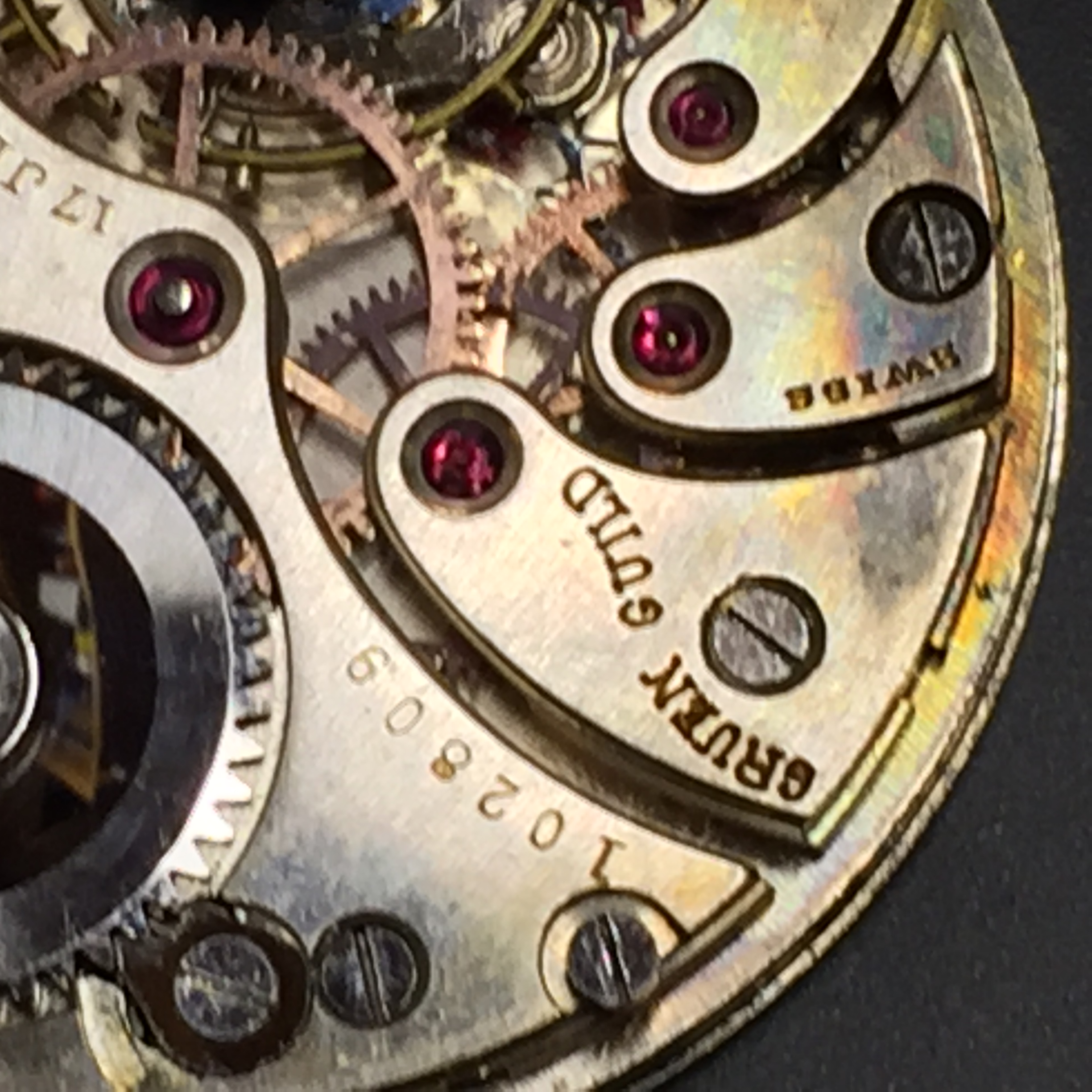 Some mentions of this caliber recently, so wanted to share 2 examples in hopes of learning more about it. This caliber appears to have been introduced at the end of 1920/beginning of 1921. When first introduced, it had 4 adjustments, and the serial number stamped on the bridges, in addition to identical sn on the front plate. The earliest Gruen version I’ve seen is sn 101874 that recently sold on the bay—this may have been a first run for Gruen. The earliest cased version I’ve seen is sn 103037 (still w/4 adj & bridge sn), in Gruen/Wadsworth-signed Ultra Qual case # 360419. That puts it at mid-1921, which along with the caliber # stamp on all examples I’ve seen is why i say it may have gone into use in 1921, with first production maybe at the end of 1920. The serial numbers accelerate quickly, seemingly far beyond Gruens usage, so likely it was the common maker’s sn series, not exclusive to Gruen. Hoping others can share any similar examples.