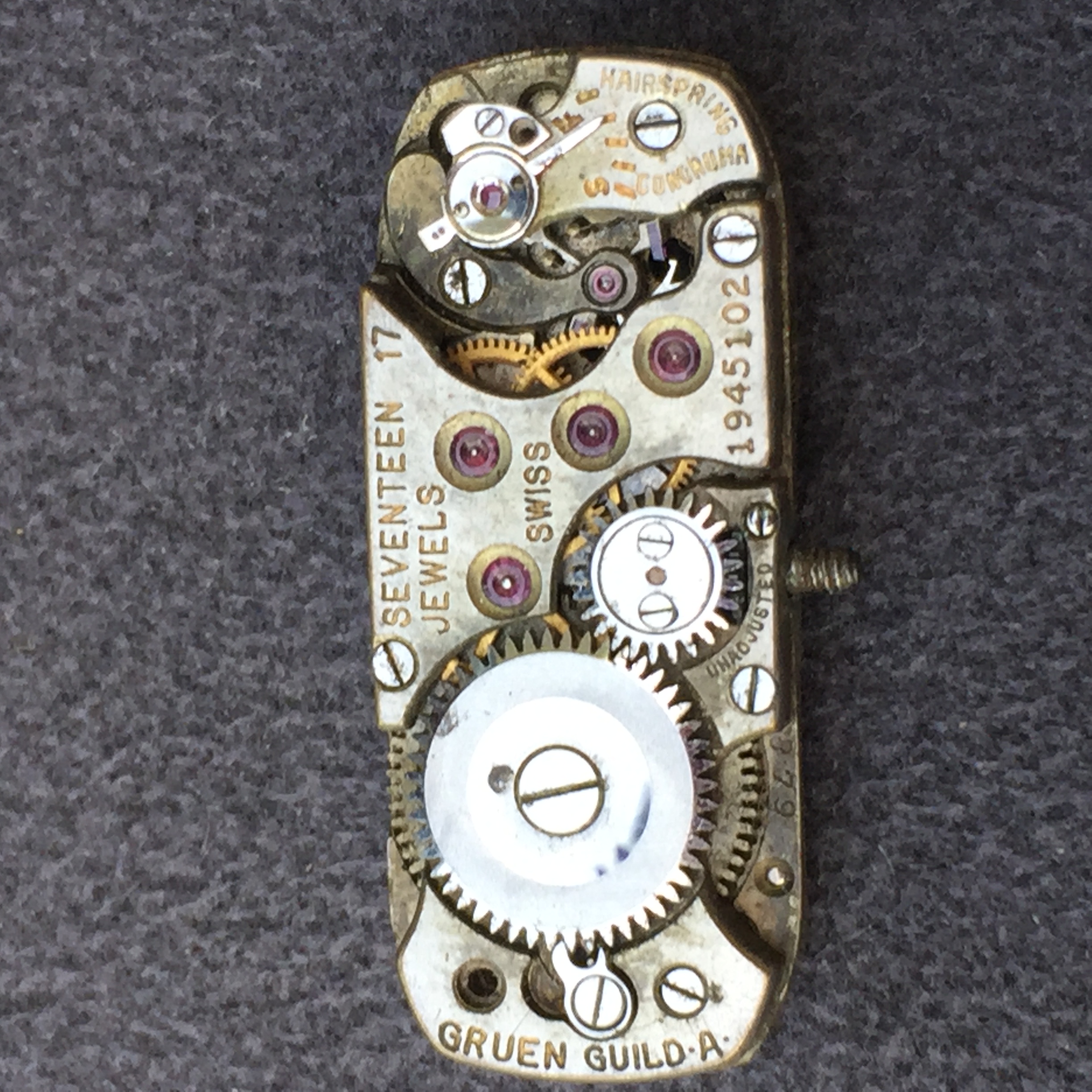 Here is one I found in the spares drawer, to show the usual Gruen patent stamp on the front plate. It’s sn 1945102, marked Conoruma. So Conoruma appears sometime between 1939777 and here.