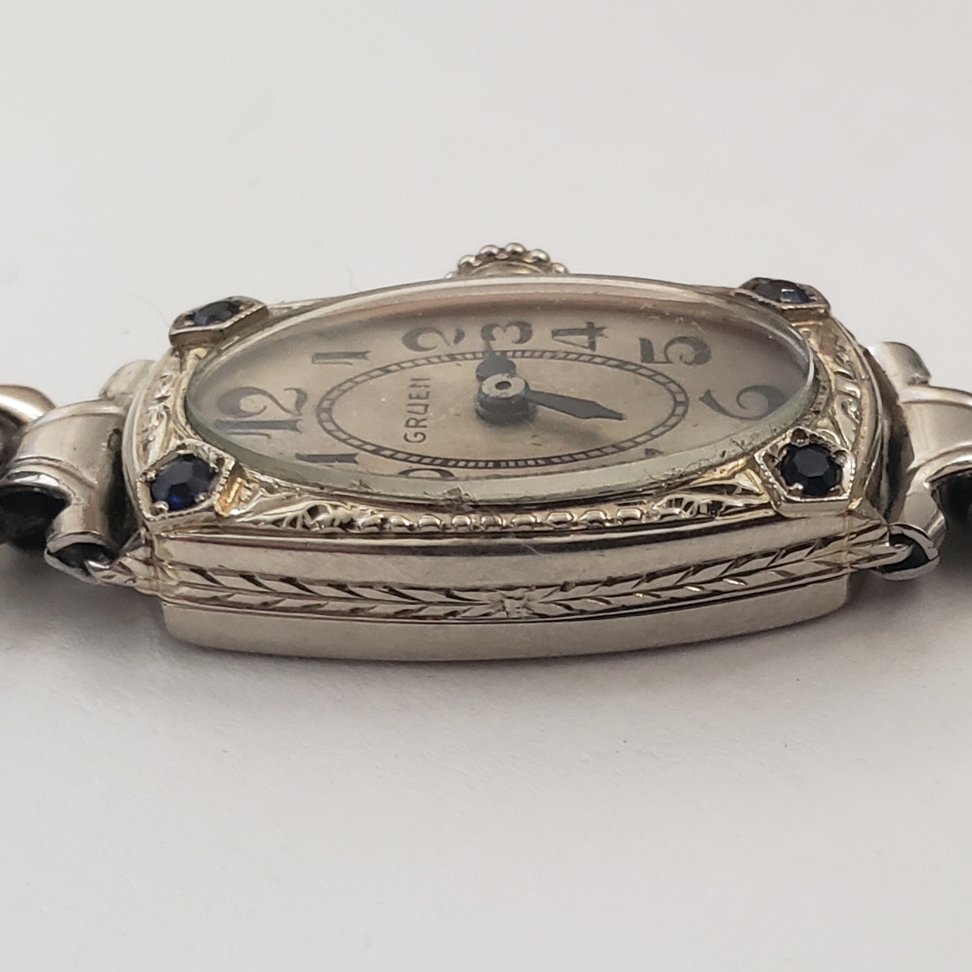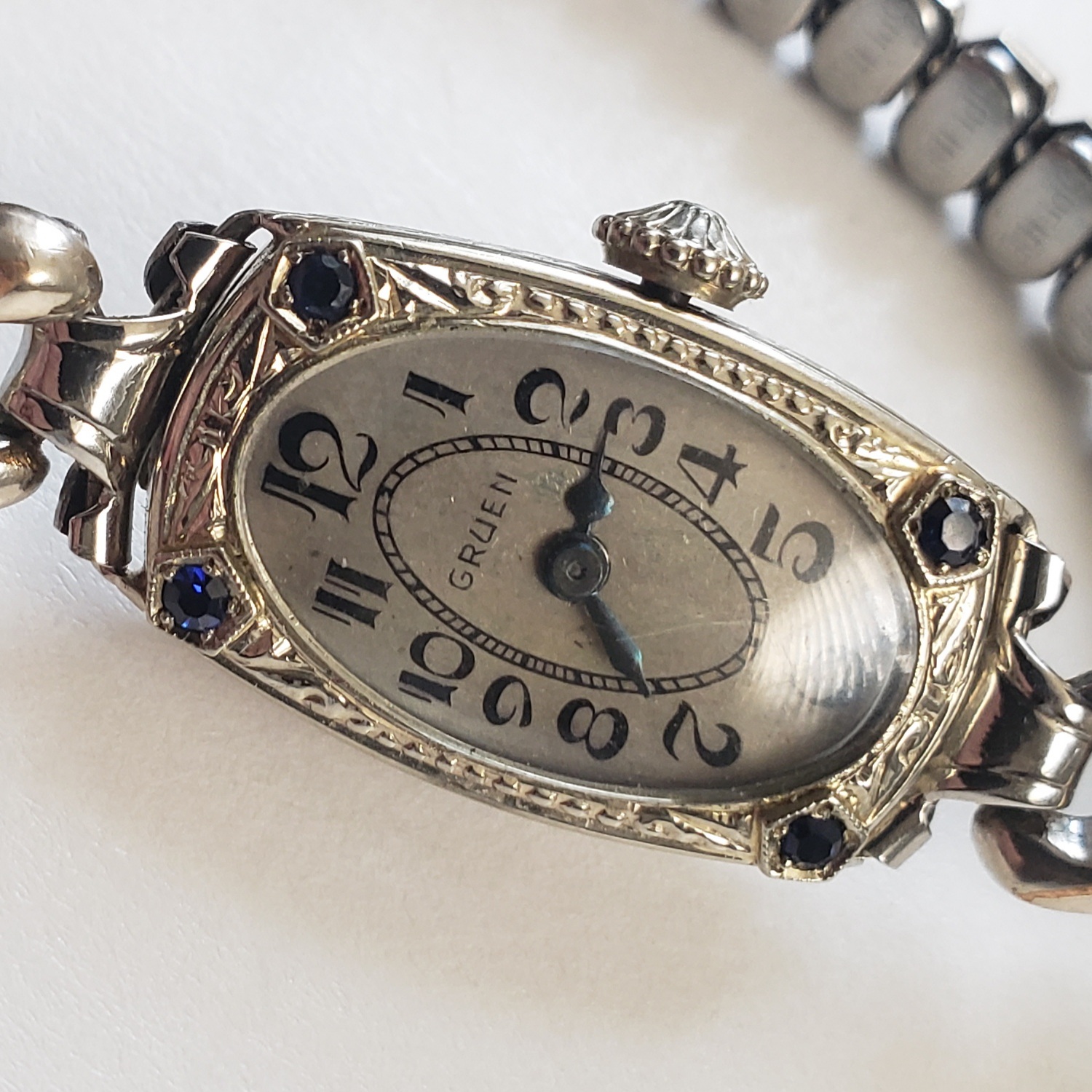 My dating would come up with a 1925/26 date, so definitely in the range. I assume that it is a Cartouche 23 with sapphires instead of diamonds. I love the stone settings being an hommage to the Pentagons, absolutely Gruenish!