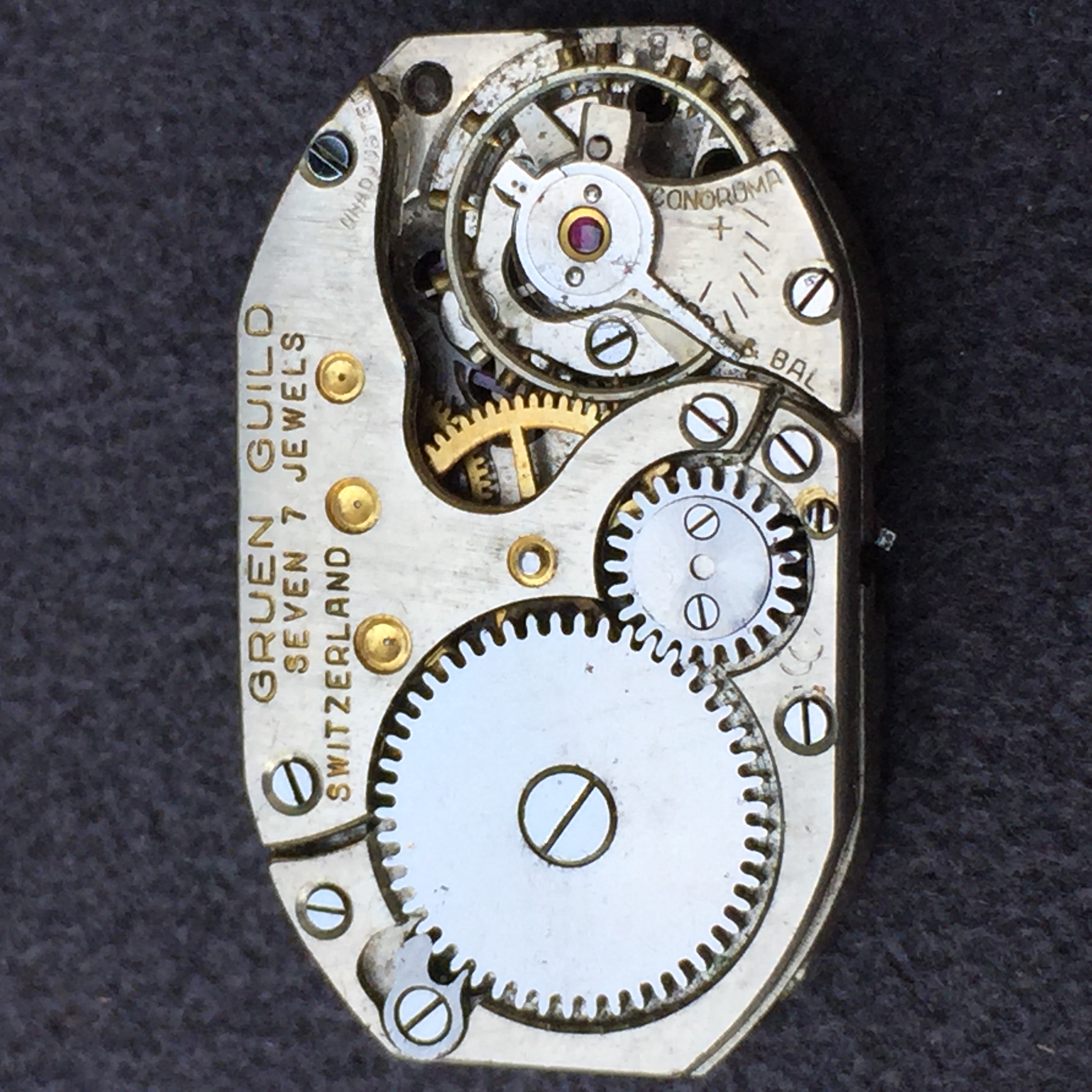 This one bears only Gruen Guild marks (no A) and no full Aegler sn on bridges. Conoruma stamps. Presuming it is transitional, ca1933-35.