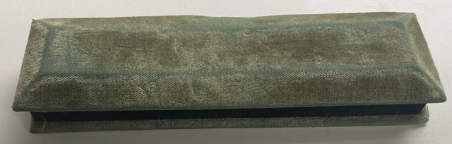 Green velvet top with black “rim”. Same in bottom. Hinged. Gruen service crest inside top. Army green bottom. Watch holder from black velvet. Dent in lid not as designed.