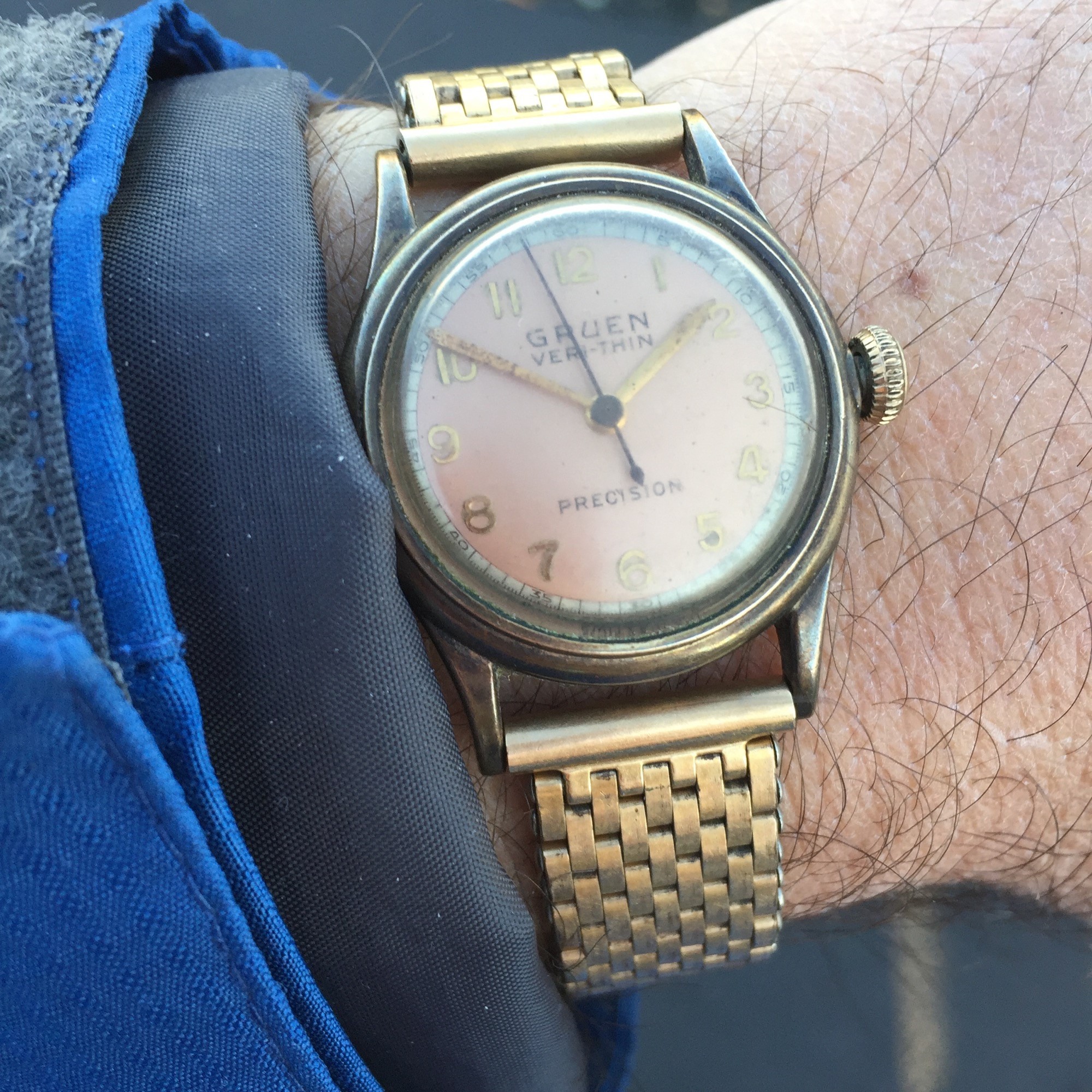Hard to capture the pink gold, but the dial color is clear. “Scientist” is the only model of this type I’ve seen so far offered in pink gold, shown in grainy image in our 1940s ads thread. Description in 1941 ad matches, except the bracelet: 17j, sweep seconds, pink gf case & Guildite back. Ad is a stretch bracelet, but this one matches the case color exactly. If not original, it's a sweet addition.