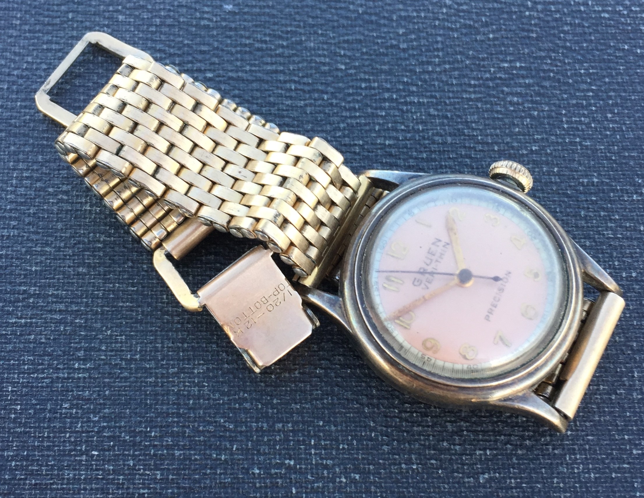 Hard to capture the pink gold, but the dial color is clear. “Scientist” is the only model of this type I’ve seen so far offered in pink gold, shown in grainy image in our 1940s ads thread. Description in 1941 ad matches, except the bracelet: 17j, sweep seconds, pink gf case & Guildite back. Ad is a stretch bracelet, but this one matches the case color exactly. If not original, it's a sweet addition.