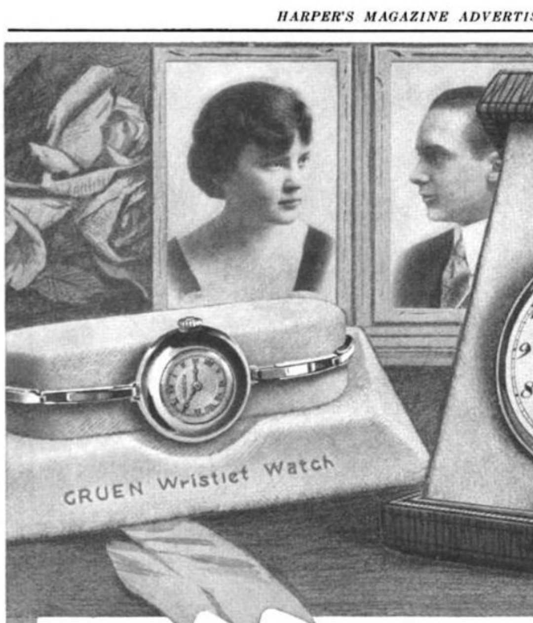 Ok, thanks! Yup, there are these images of Gruen Wrislet Watch inserts from 1916. But I have yet to see a box in an advertisement that matches my box exactly. My insert is not removable. Good to know I'm in the ballpark. The 1912 boxes have similarities to mine but the inserts are quite different. So what was the colour of velvet in the wristlet boxes before brown?