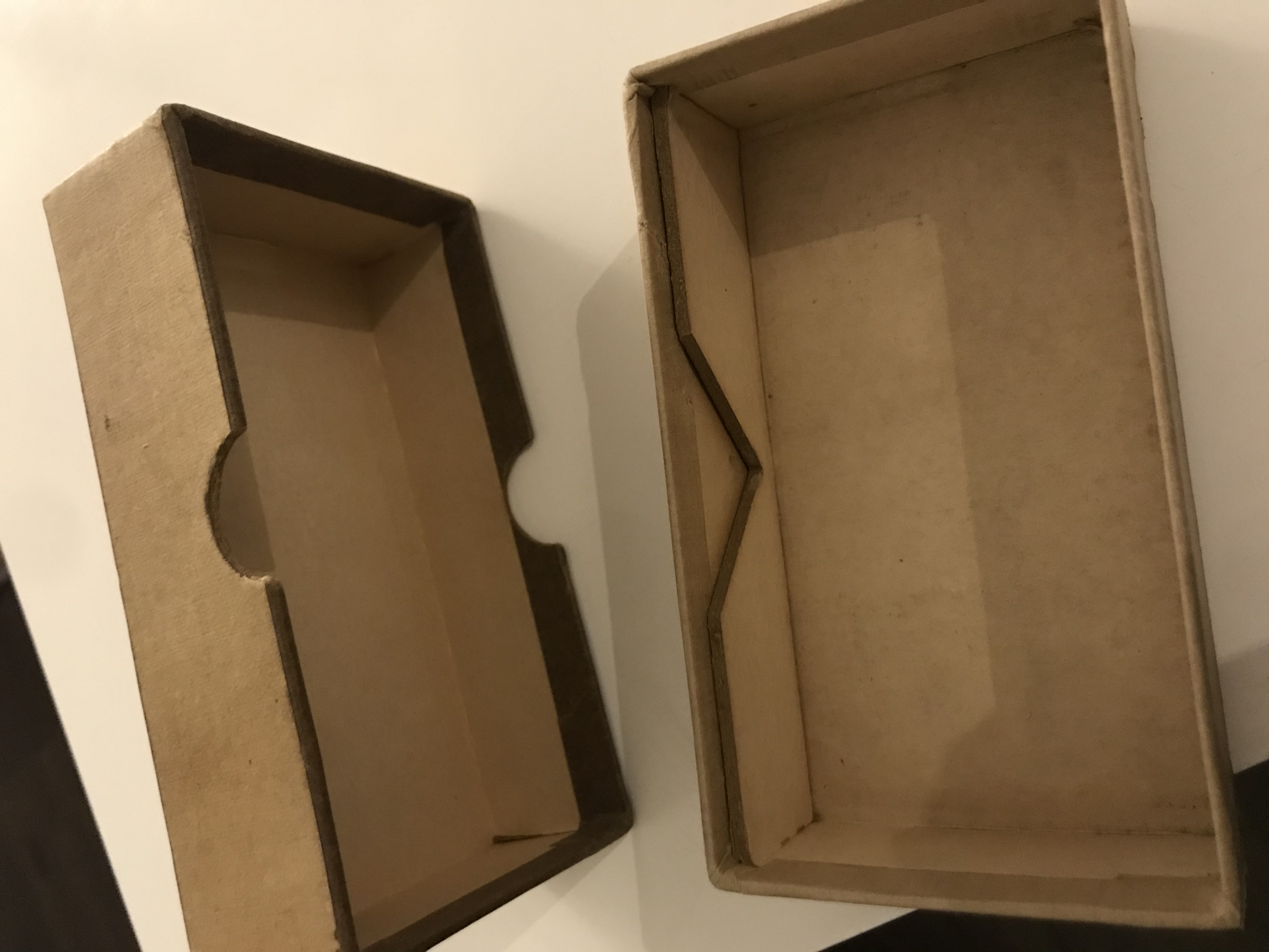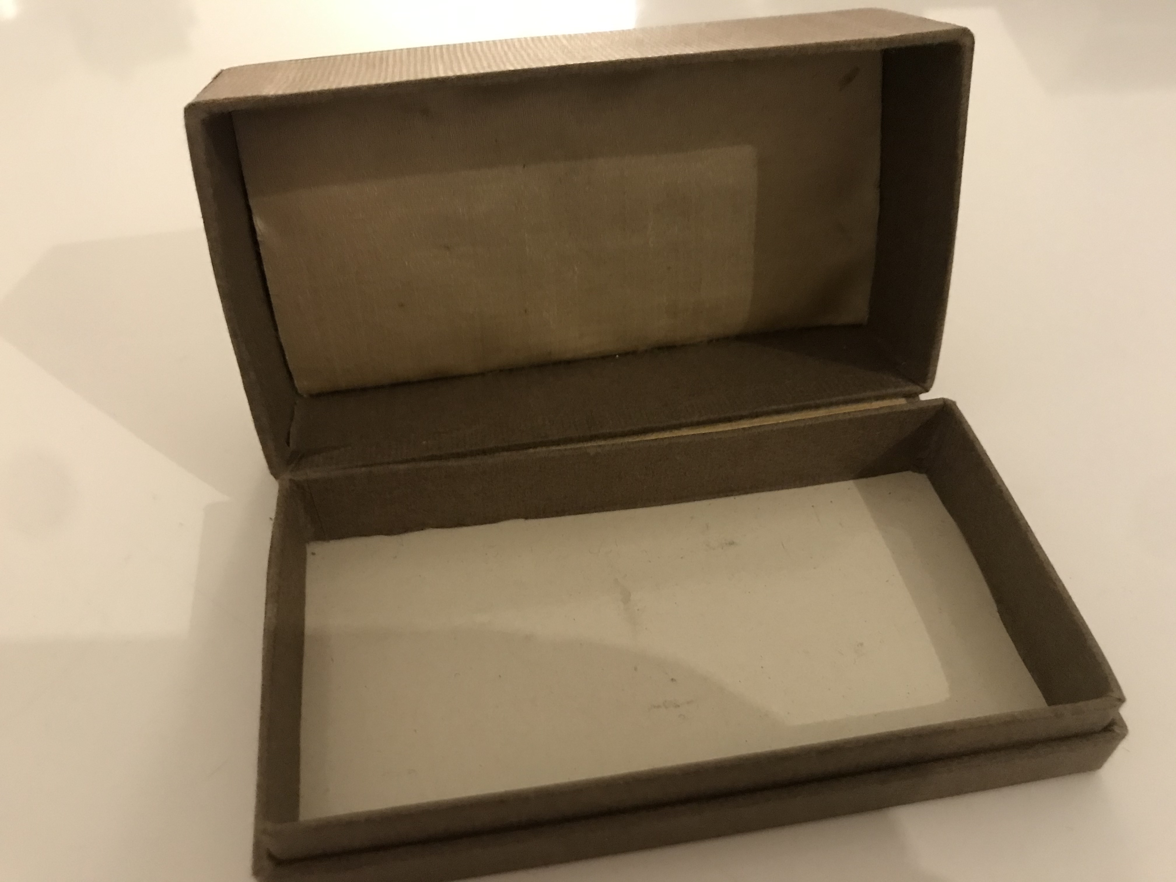 Impressed in the bottom of the inner box is “Dennison maker”. The Dennison Mfg. Company started in 1844 when Aaron Dennison (a Boston jeweller) began to make paper boxes. His father (Andrew) and he made a machine to facilitatie the making of cardboard boxes. At the time most jewel boxes were imported. In 1863 the company produced lots of paper stuff (jewelry tages, display cards) and in 1914 crepe paper. One of the sales offices was in Cincinnati. Today the factory still exists in combination with Avery.