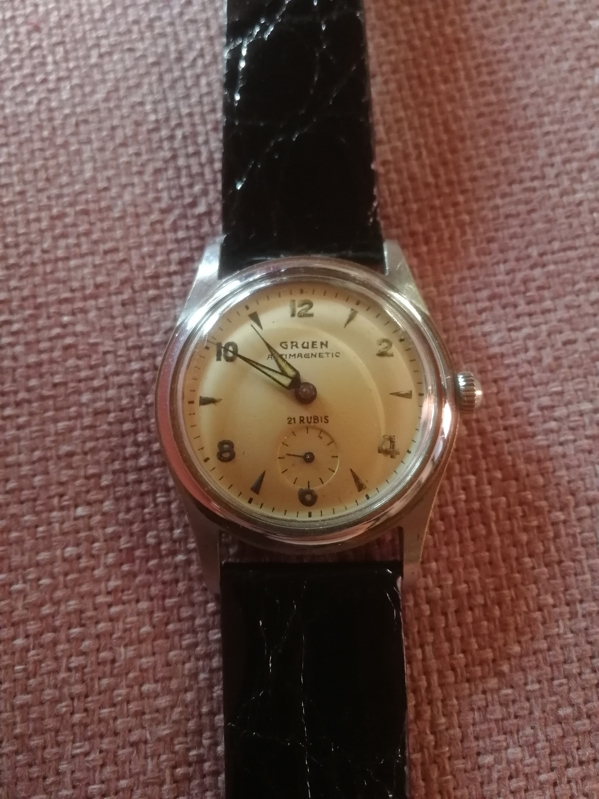I'm an italian guy, and I've just received from my mother a Gruen "Antimagnetic" wristwatch that came from my grandpa, who exchange it with a pack of sigarette from american soldier during WWII.
