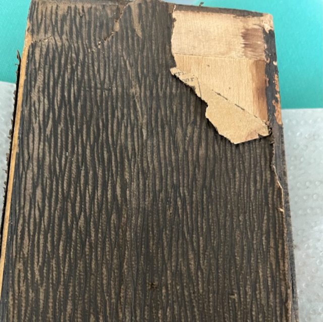 Fake wood box with gold inscription. Has a nice slide out locking feature, why would they not use this over the dreaded hinge or snap they use today? Liz or someone who has the full set please post, the box belongs to a very nice set of boxes. I only have bits and pieces of the full set.