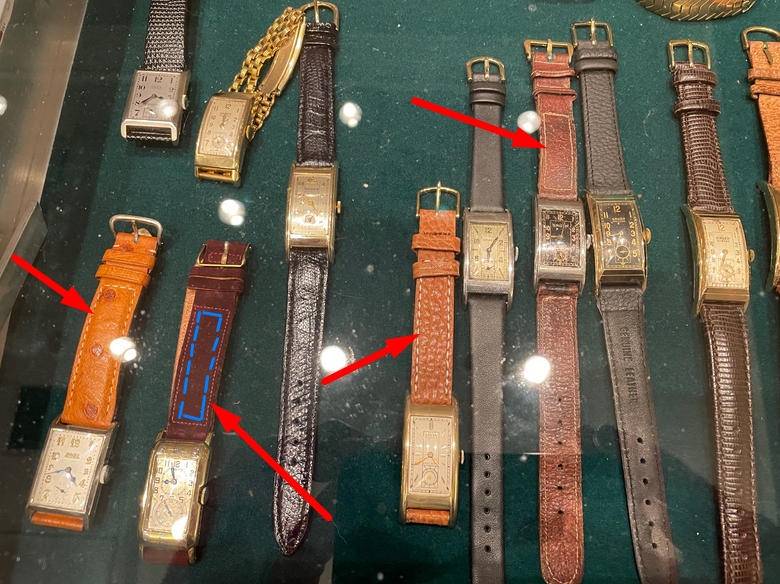 Une question concernant les coutures sur les bracelets en cuir. Sur certains bracelets (4 au bout des flèches rouges), sur le demi-bracelet recevant la boucle, les coutures forment un rectangle (pointillé bleu).