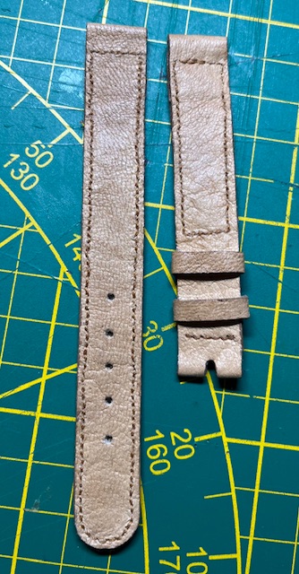 A question about the stitching on leather bracelets. On some bracelets (4 at the end of the red arrows), on the half bracelet receiving the buckle, the seams form a rectangle (dotted blue).